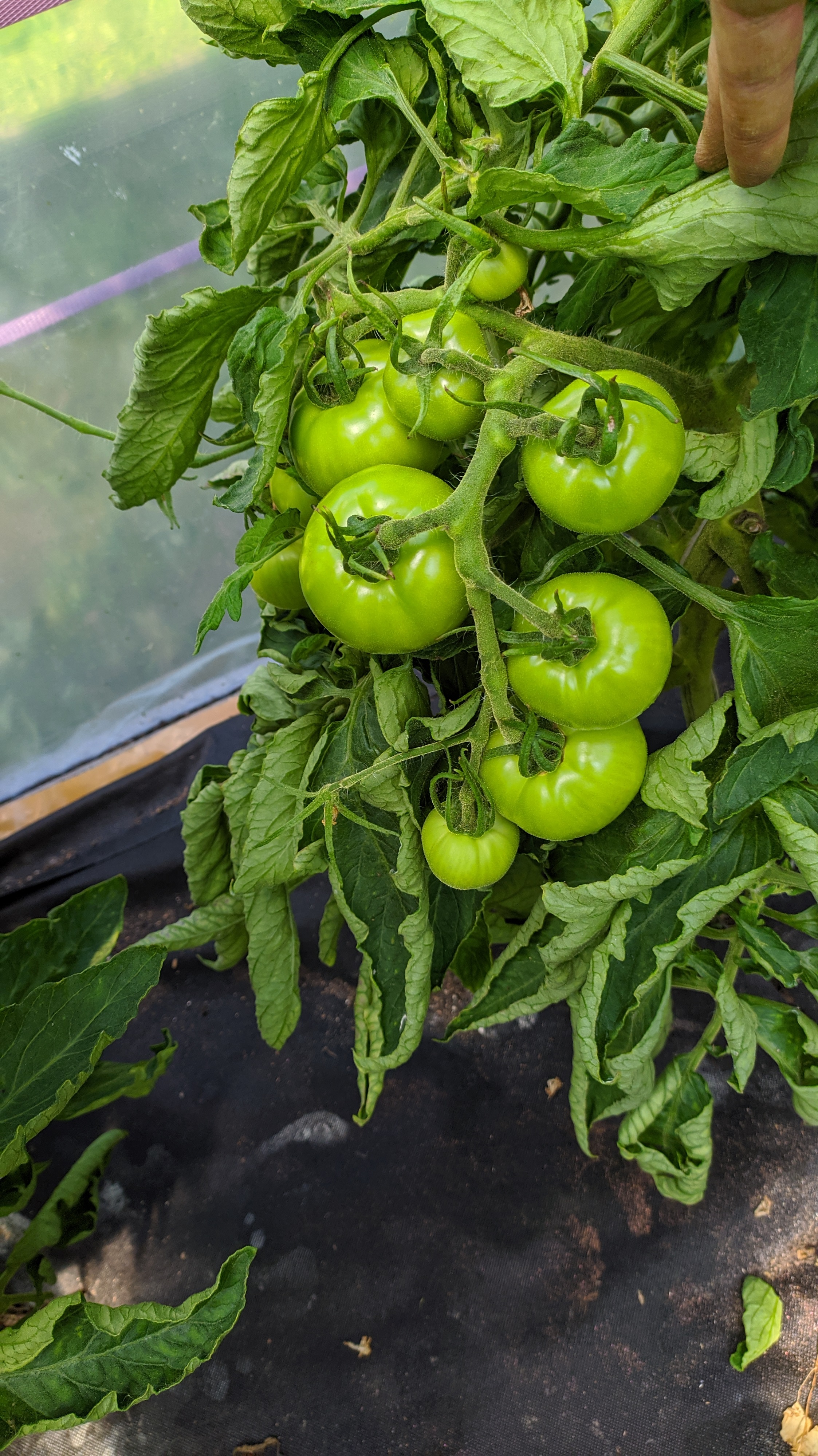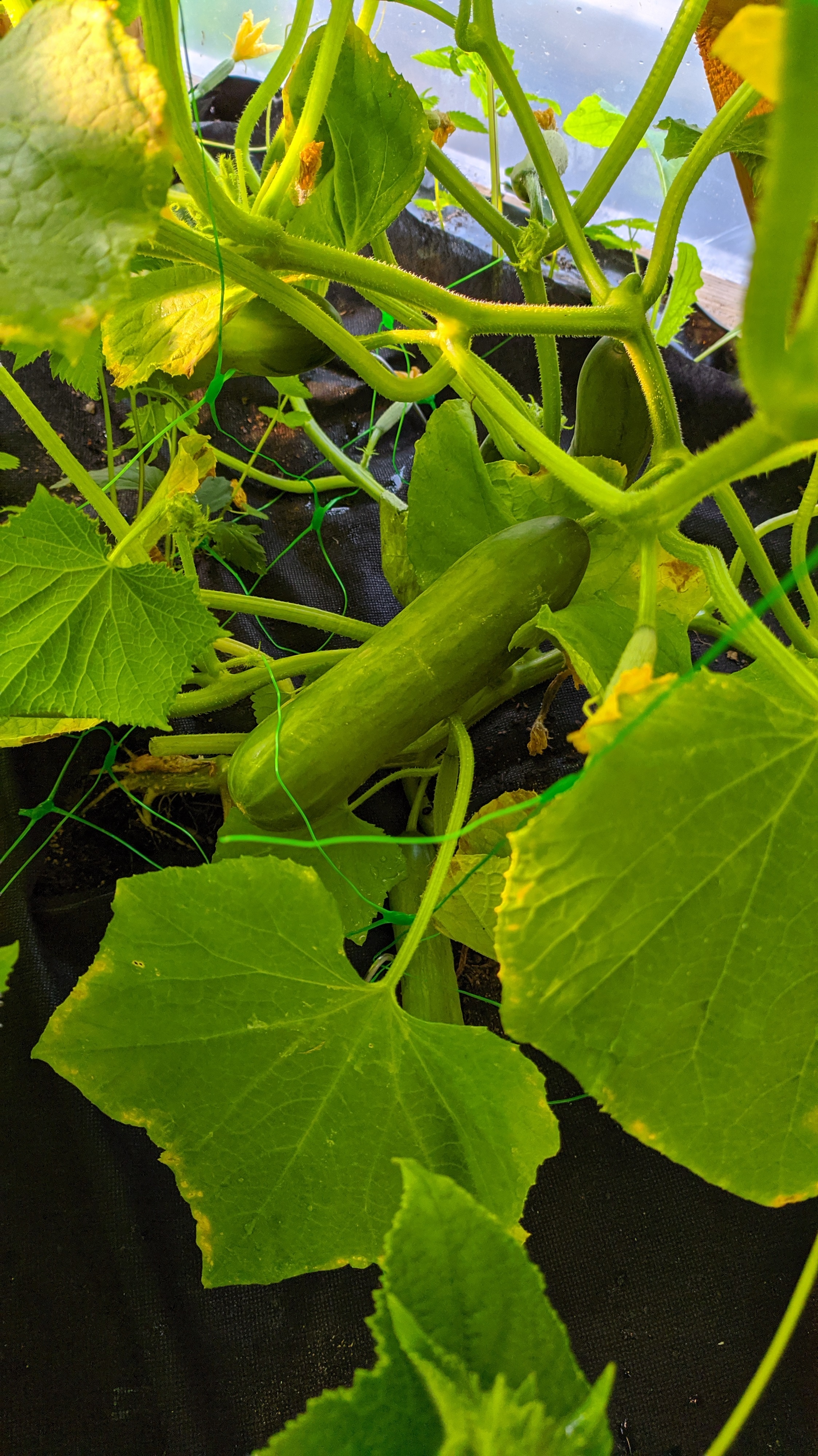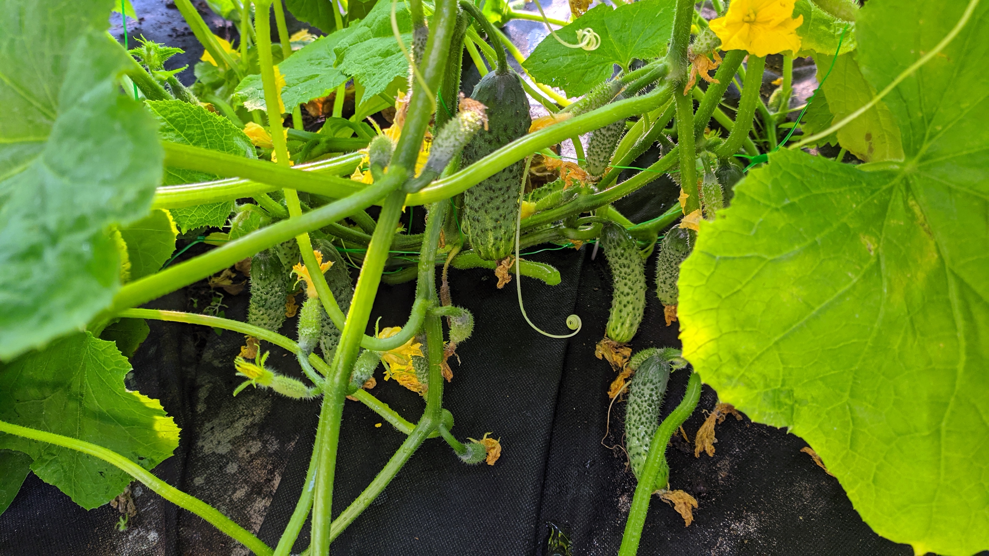 Картофан уже во всю цветет. Я прогуливался по деревне, ну и краем глаза палил что у кого как растет. Так вот у всех такая скудная картошка, а у меня прям здоровая, зеленющая. Не зря я жопу рвал, когда поле перекапывал, вносил удобрения, всякие микроорганизмы подселял от вредителей и тд. В парниках вот уже куча помидор, огурцов. Огурцы так я вообще уже мариновать начал. Я в парнике под огурцы натянул сетку вдоль грядки, чтобы они сами по ней лезли наверх. Но не очень нравится мне такое решение. Я еще их не пасынкую, так как земля норм и растение вывозит неконтролируемый урожай. Но получается слишком густо как в джунглях. Думаю все же выгодно подзапариться и индивидуально плети подвязывать, тогда их можно и вдоль и поперек разводить. Ну а часть просто удалить.