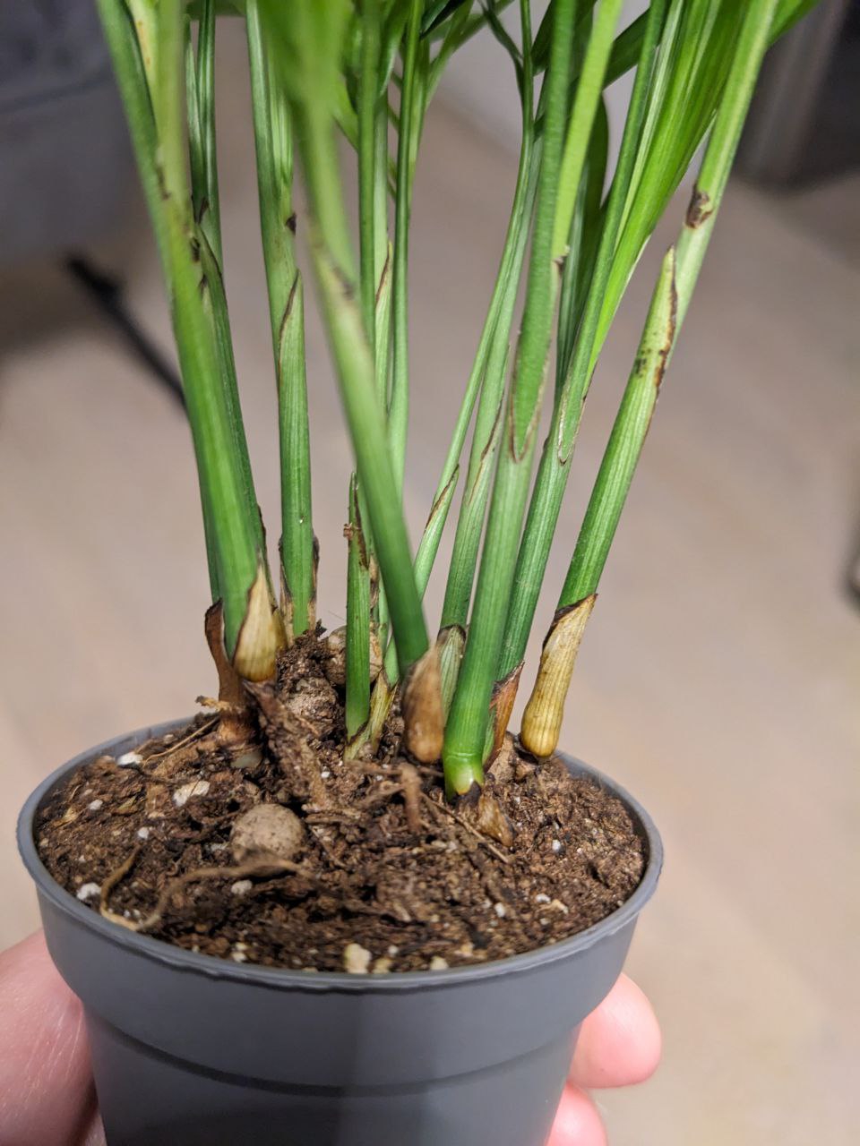 Анонче, помогите. Что с моей хамедореей? Кажется, выглядывают корни и у корней что-то коричневое. Надо просто пересадить? Этот горшок (в нём купил) где-то 6см диаметр.