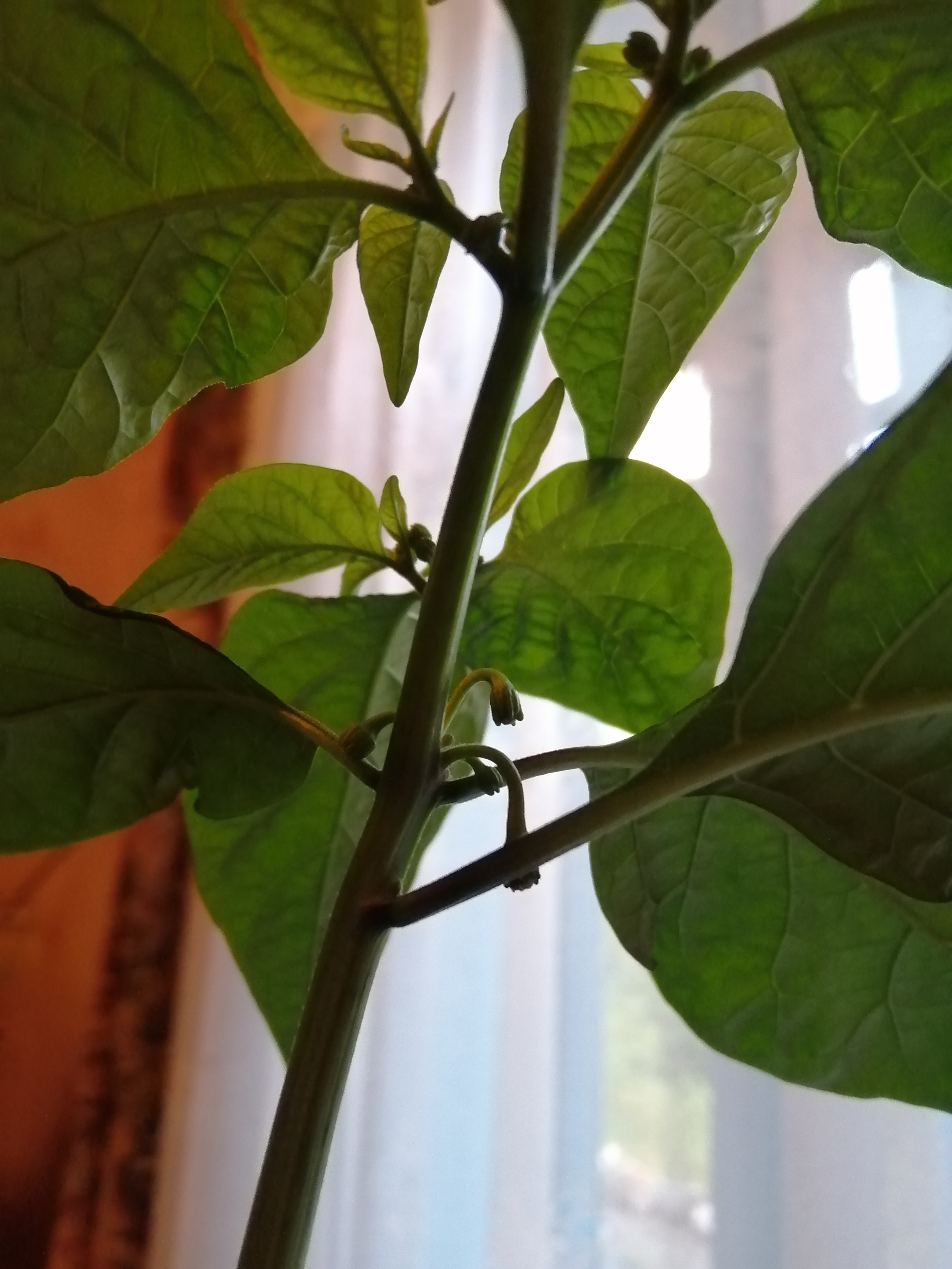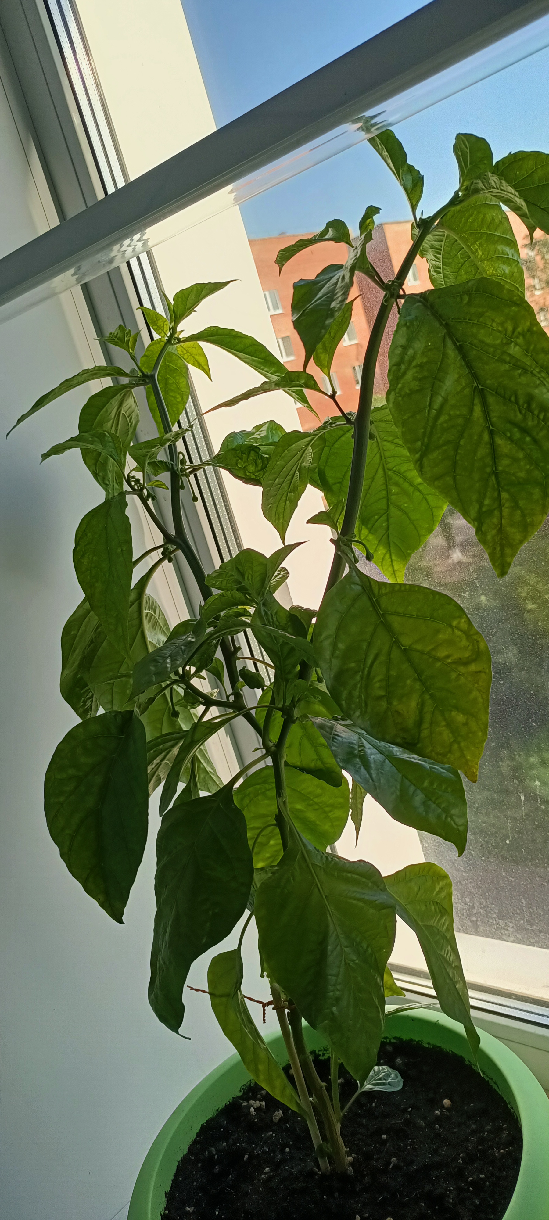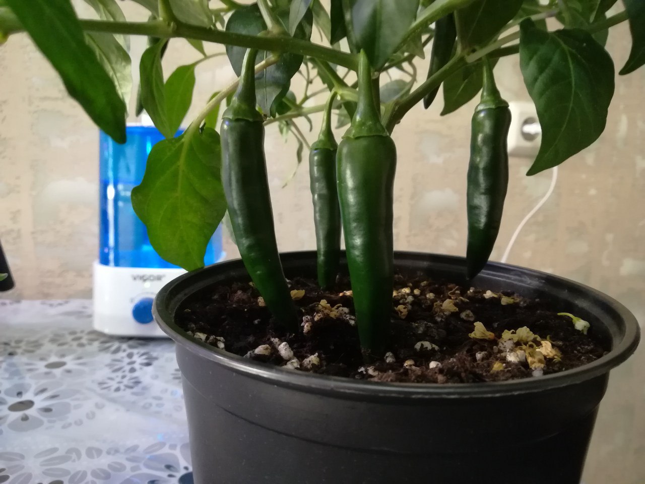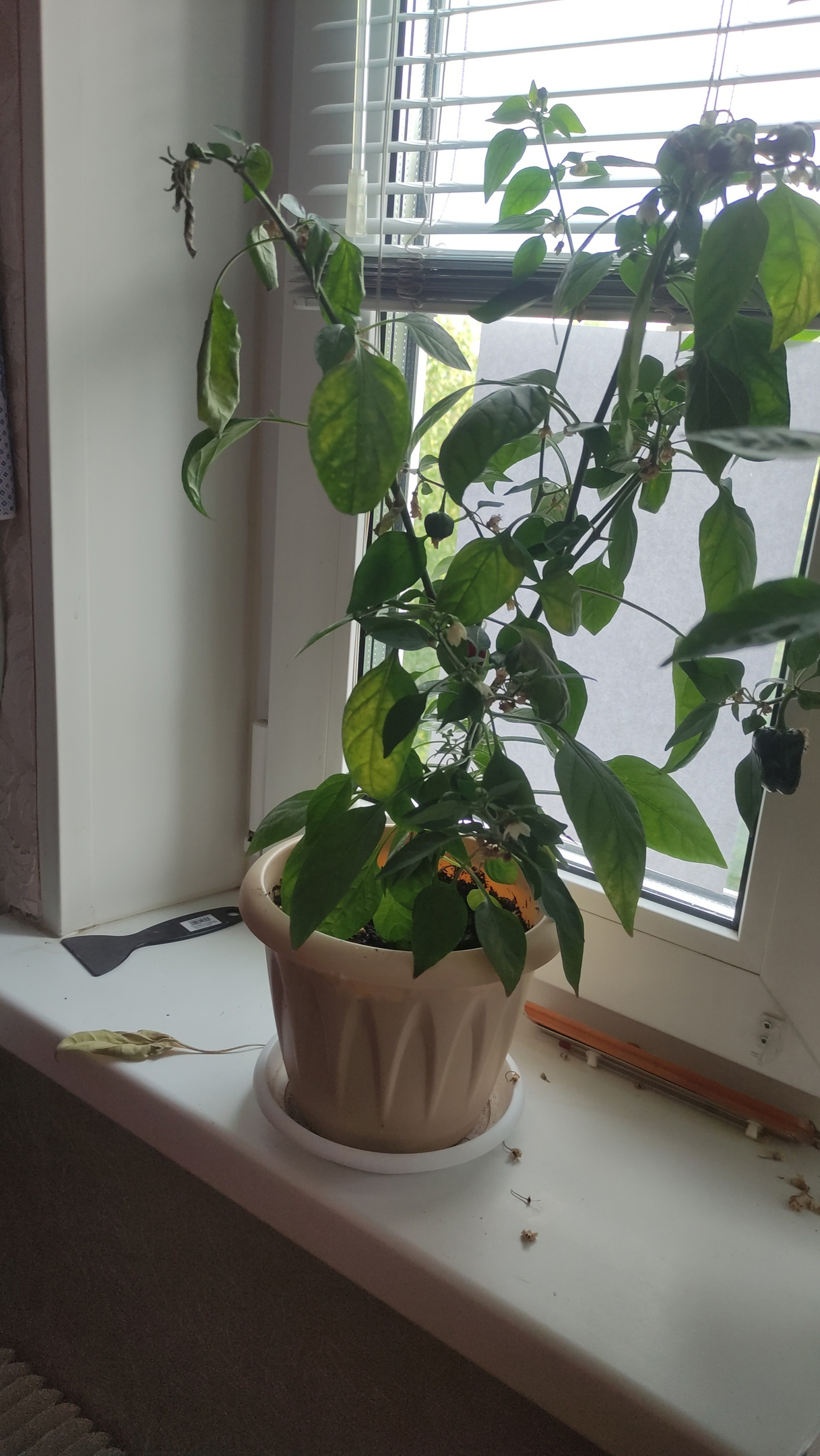 Смарите какой вырос пиздюк. Это там 12 соцветий маленьких ещё, одно в самом центре отсохло вроде как, ну, чёрным стало. Это что, у меня 12 перчиков моруги будет, или оно всё может нахуй поотпадать?