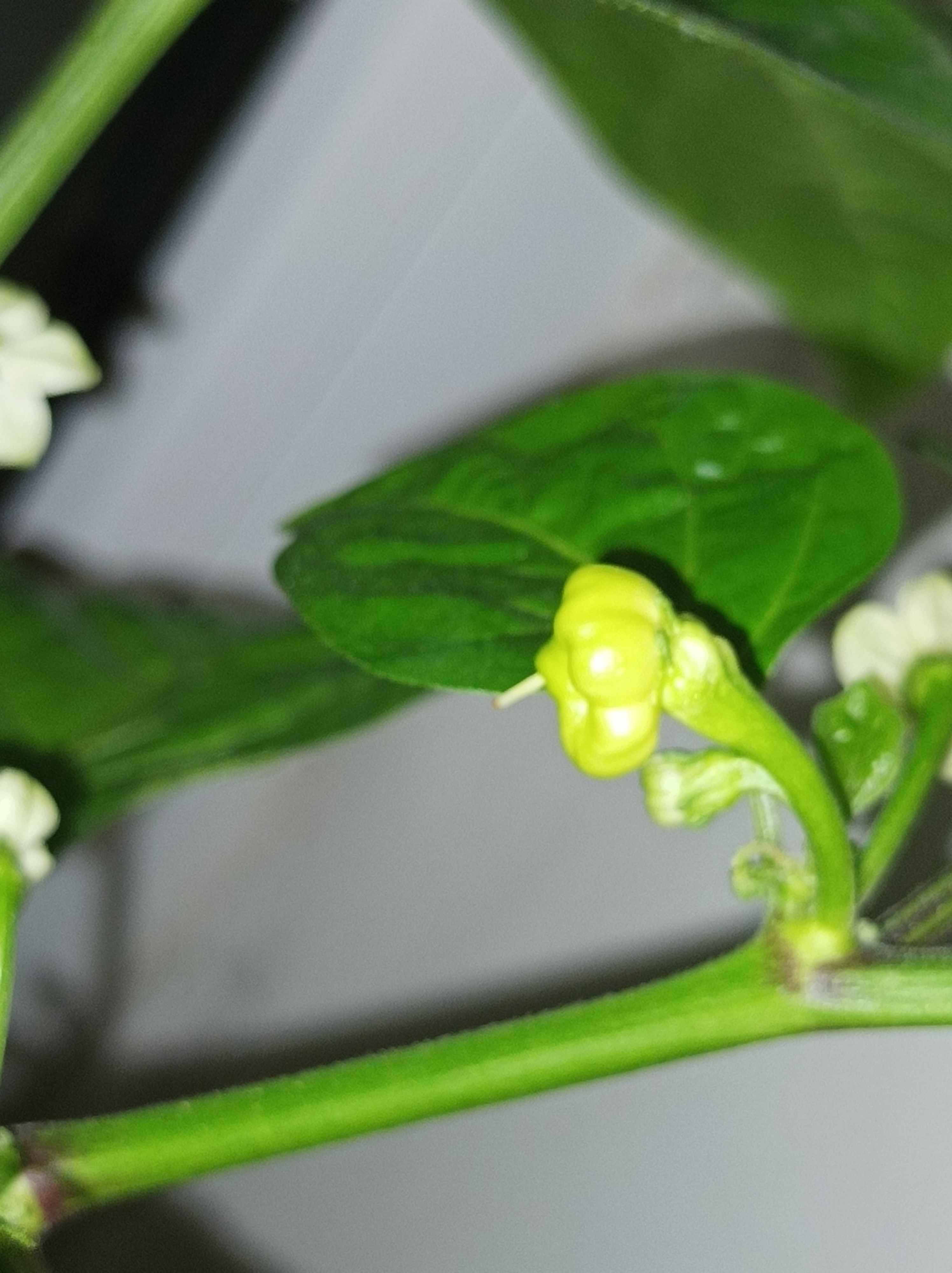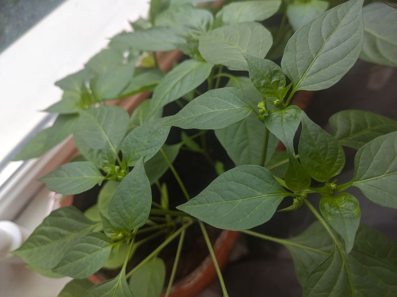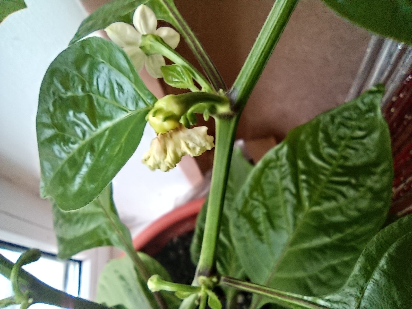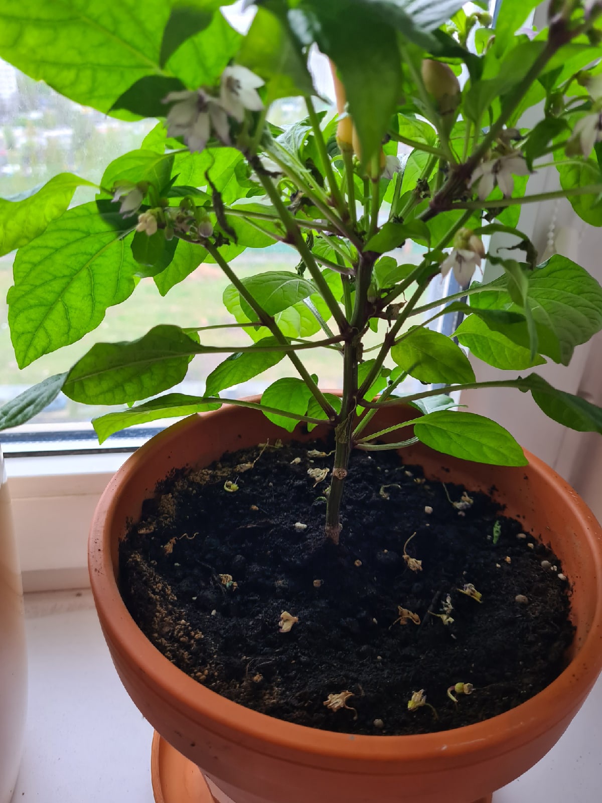 Смарите какой вырос пиздюк. Это там 12 соцветий маленьких ещё, одно в самом центре отсохло вроде как, ну, чёрным стало. Это что, у меня 12 перчиков моруги будет, или оно всё может нахуй поотпадать?