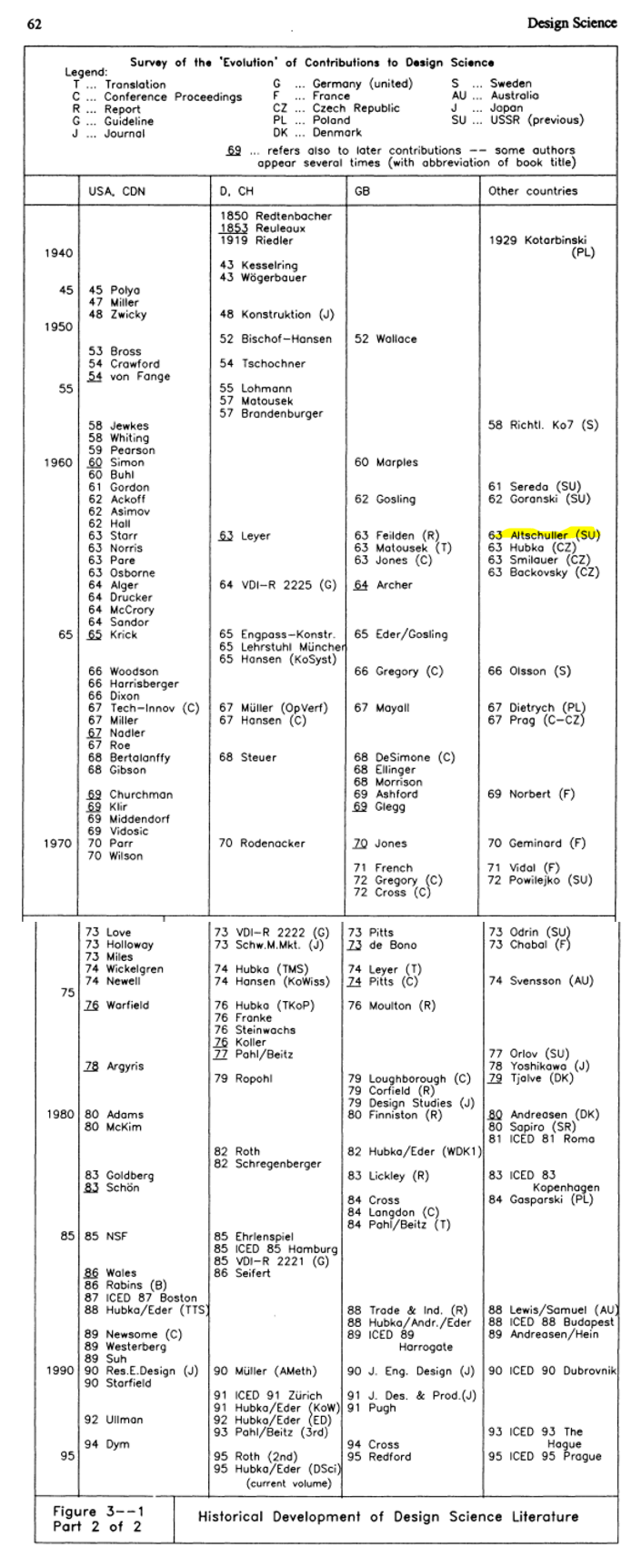 Что касается сферы инженерии, архитектуры, механического и промышленного дизайна, СССР со странами Запада даже рядом не валялся. В то время как Альтшуллер пуританил свою козявку в огороженном от всего мира совке, на Западе методологическими разработками в инженерии занимались сотни человек (примерный таймлайн можно посмотреть в книге Hubka, Eder, Design Science, Introduction to the Needs, Scope and Organization of Engineering Design Knowledge), см. пикчу. Де-факто, СССР полностью утратил свой инновационный потенциал и конкурентоспособность примерно к середине семидесятых. К моменту развала совка он отставал от Запада в данном отношении на два гигапарсека, и никаких шансов на занятие приличного места в глобальных технологических цепочках, кроме небольшого количества тем (атомка и космос) у него не было от слова совсем.