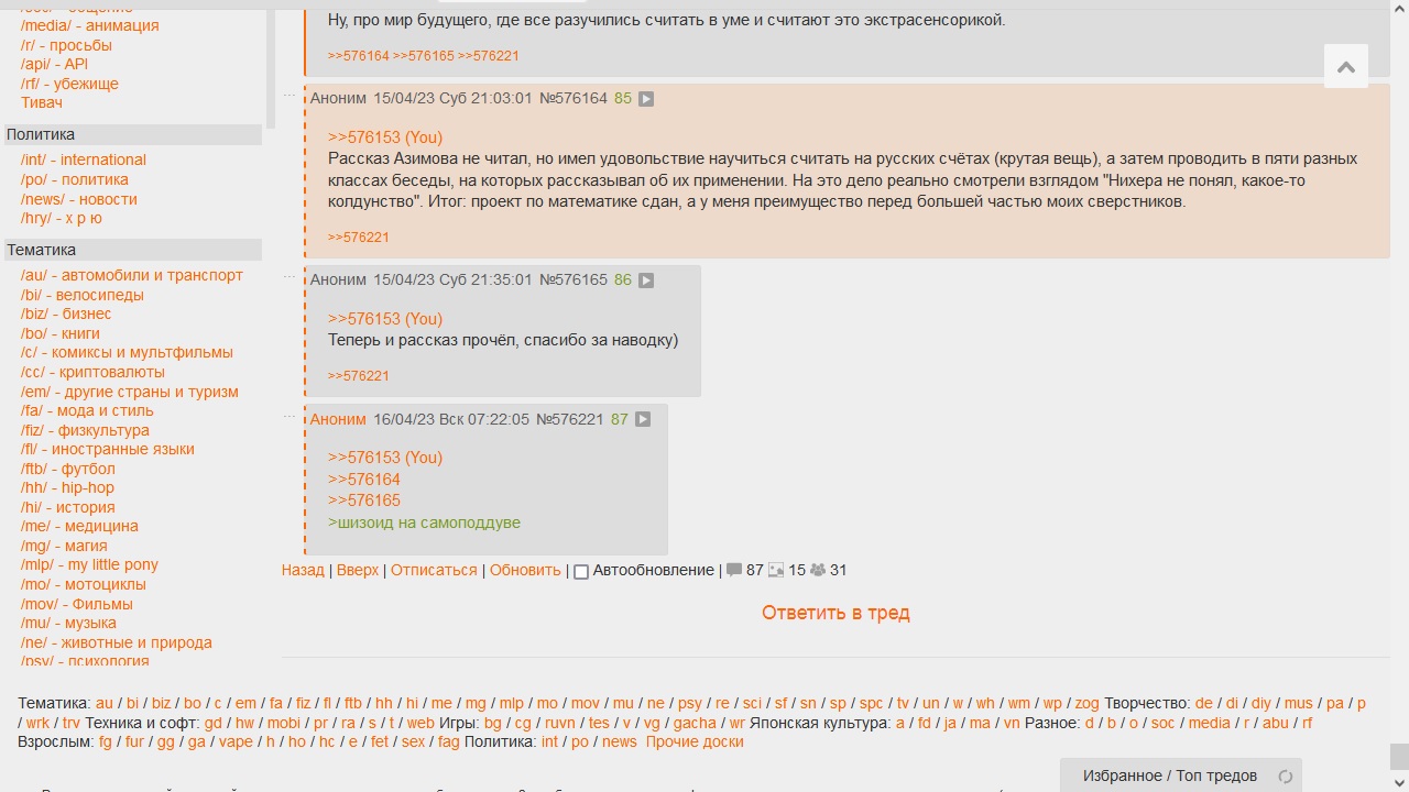 >>576153 Рассказ Азимова не читал, но имел удовольствие научиться считать на русских счётах (крутая вещь), а затем проводить в пяти разных классах беседы, на которых рассказывал об их применении. На это дело реально смотрели взглядом "Нихера не понял, какое-то колдунство". Итог: проект по математике сдан, а у меня преимущество перед большей частью моих сверстников.