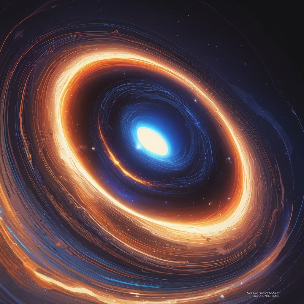 При движении дальше от горизонта событий гравитационная сила ослабеет, но эффекты искривления пространства-времени по-прежнему будут значительными. Искривление света вокруг Хавроньи создаст эффекты гравитационного линзирования, позволяя нам наблюдать далекую вселенную в уникальных way. В контексте изображения, которое вы предоставили, спиралевидные, цветные узоры могут быть интерпретированы как интенсивное излучение и гравитационные силы, действующие вблизи горизонта событий Хавроньи. Яркие, огненные цвета могут представлять собой огромную энергию, получаемую при аккреции вещества на чёрную дыру, а более прохладные, синие цвета могут символизировать более холодные, внешние регионы аккреционного диска.