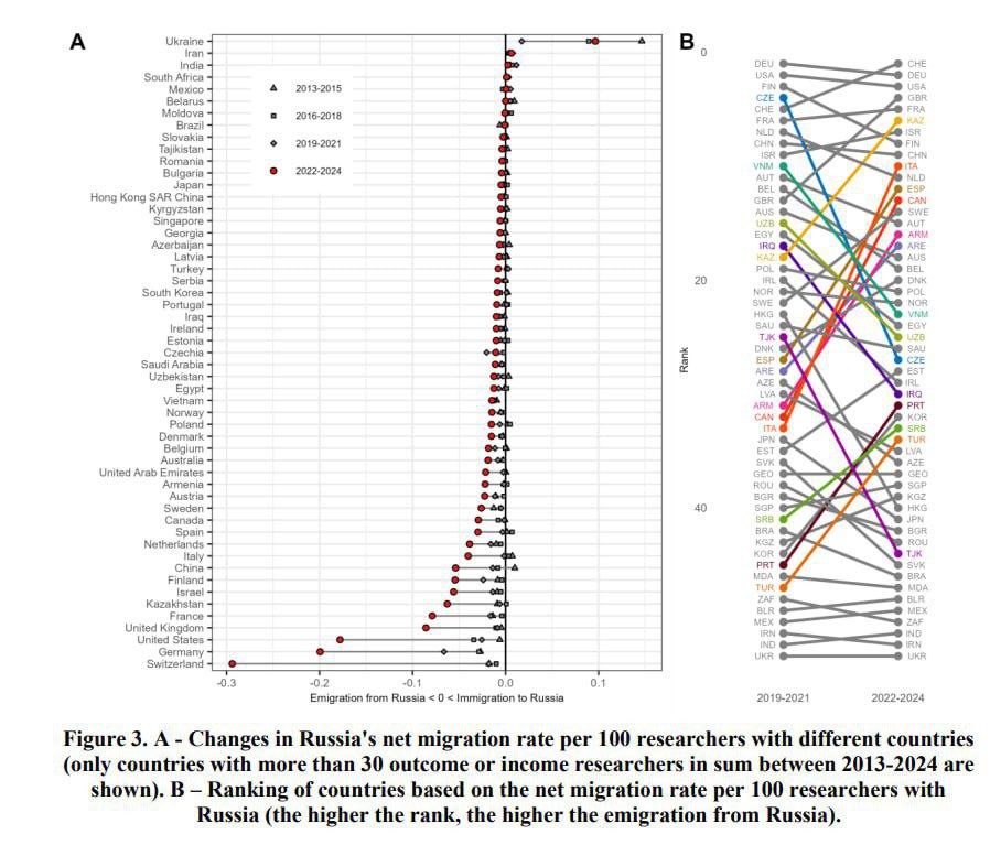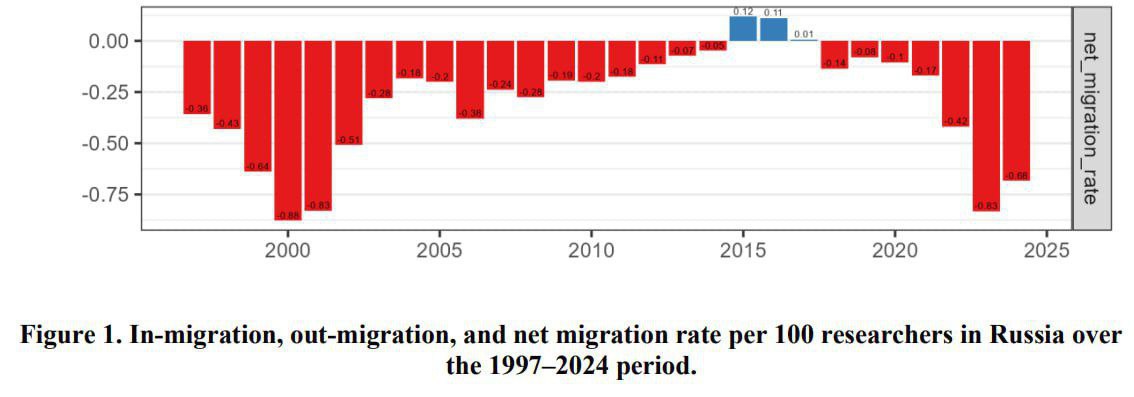"С 2022 г Россия ежегодно теряет около 0,8% активных исследователей. Такие темпы «утечки мозгов» не фиксировались с конца 1990-х. Самые пострадавшие дисциплины – физика, астрономия, информатика и математика. Наиболее значительные потоки уезжающих направляются в глобальные центры академической мобильности – в Германию, США и Швейцарию. Среди новых направлений для академической эмиграции отмечаются Армения, Объединенные Арабские Эмираты и Казахстан, в то время как роста в Китае и Индии нет.