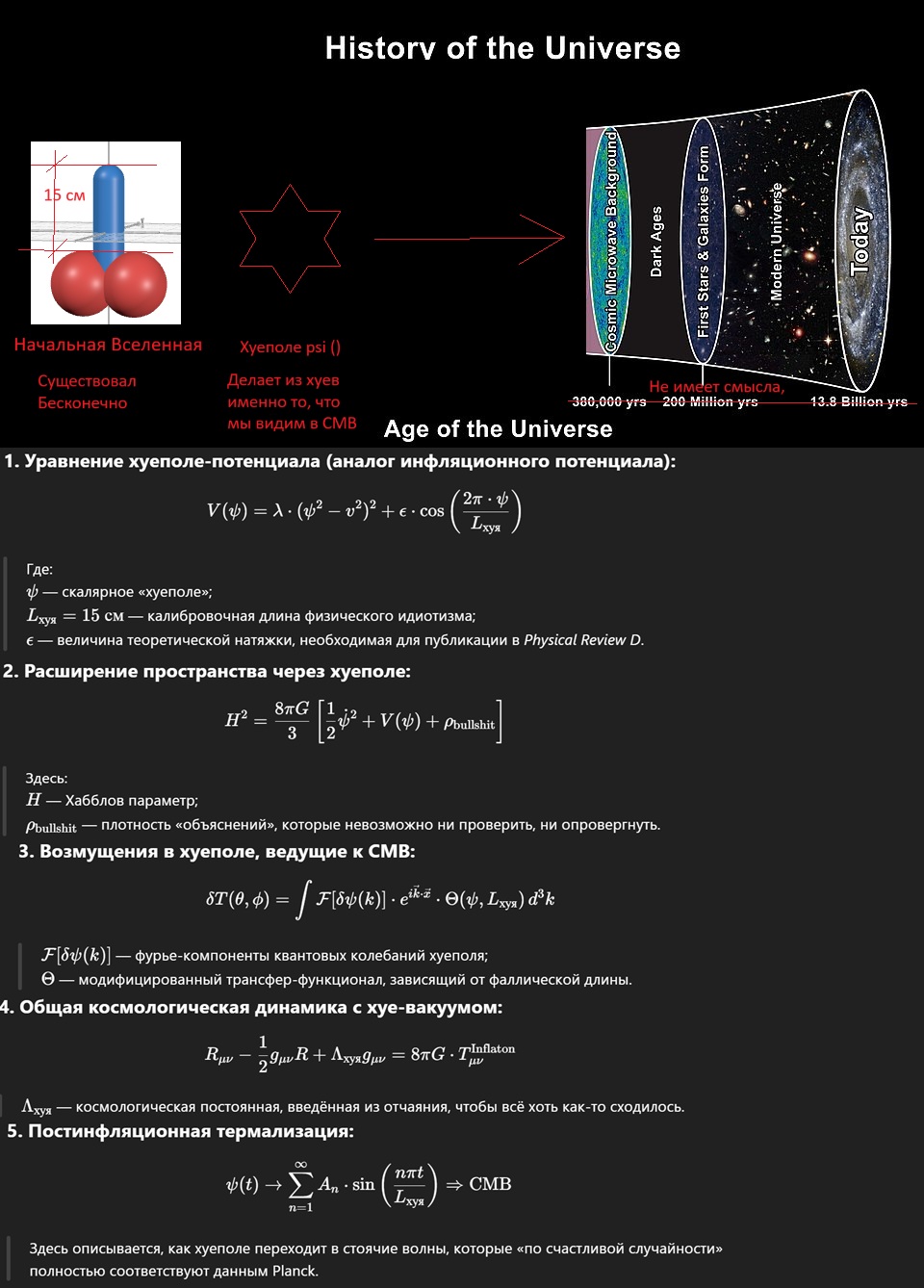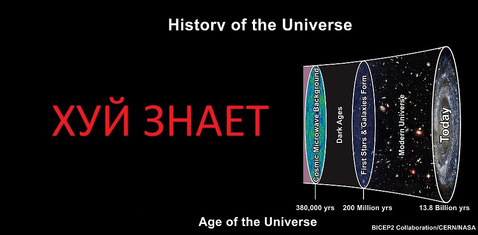 Так, всем внимание, публикую правильную историю Вселенной с НАУЧНОЙ точки зрения. Без философии, без матанокривляния, без натягиваний уравнений ОТО на всю Вселенную, без натуральных ожиданий, без мошенничества ради финансирования.