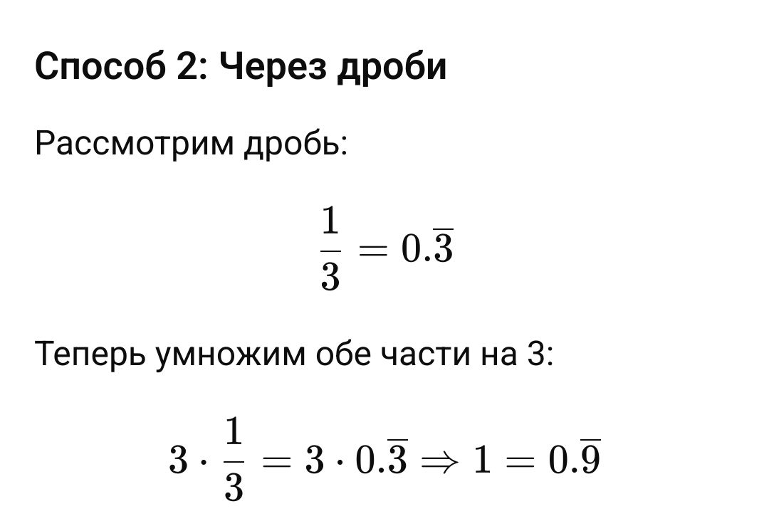 С фоты жир потек, оп-хуй не может сложить 0.99 и 0.11 не объевшись смегмы Ну и если вдруг оп просто малой, то напомню, что 1-0.(9)=0.(0)1=0 Это по сути предел в очень простой форме, где для любого 0.1 есть число меньшее его в 10 раз и при любой сложности вычисления можно брать такое значение 0.000000000001, при котором результат никак не будет зависеть от этого числа, то есть от разницы между 0.(9) и 1