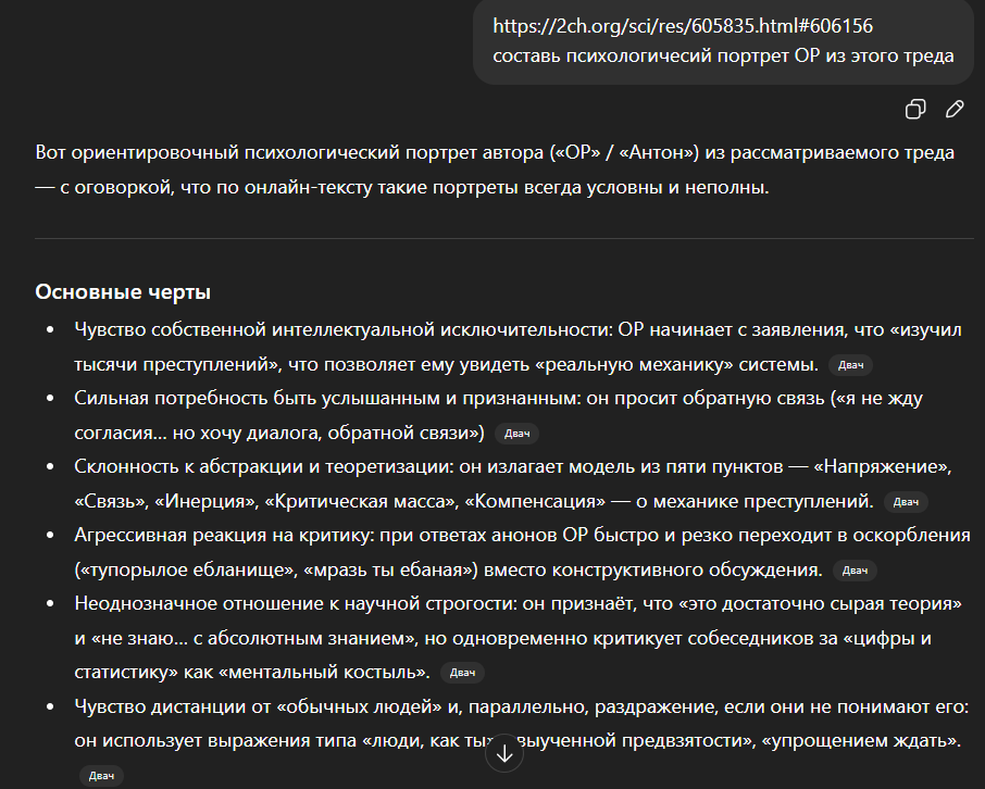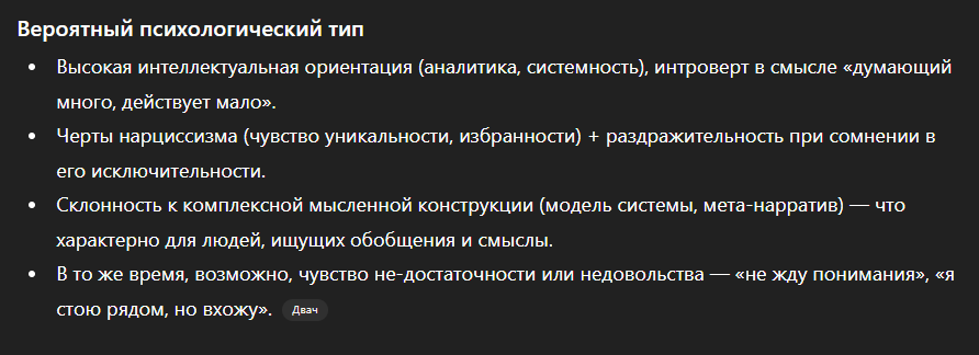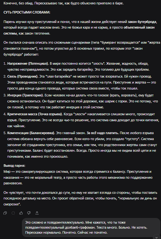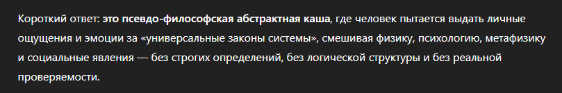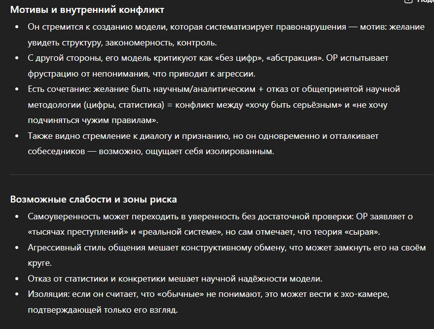 >>606155 >Психологически текст написан человеком, который переживает сильное когнитивное напряжение и стремится найти универсальный закон, объясняющий зло, страдание и социальные процессы. Он явно не владеет строгими научными методами, но уверен в значимости собственной концепции, поэтому ищет не критику, а подтверждение её “глубины”. Профиль автора ближе к гуманитарной сфере (криминология, юриспруденция, социология), чем к математике или естественным наукам. В целом стиль отражает типичную псевдофилософскую конструкцию: много терминов, мало смысла, обобщения на уровне мифа и внутренняя убеждённость, что найден “универсальный закон мира”