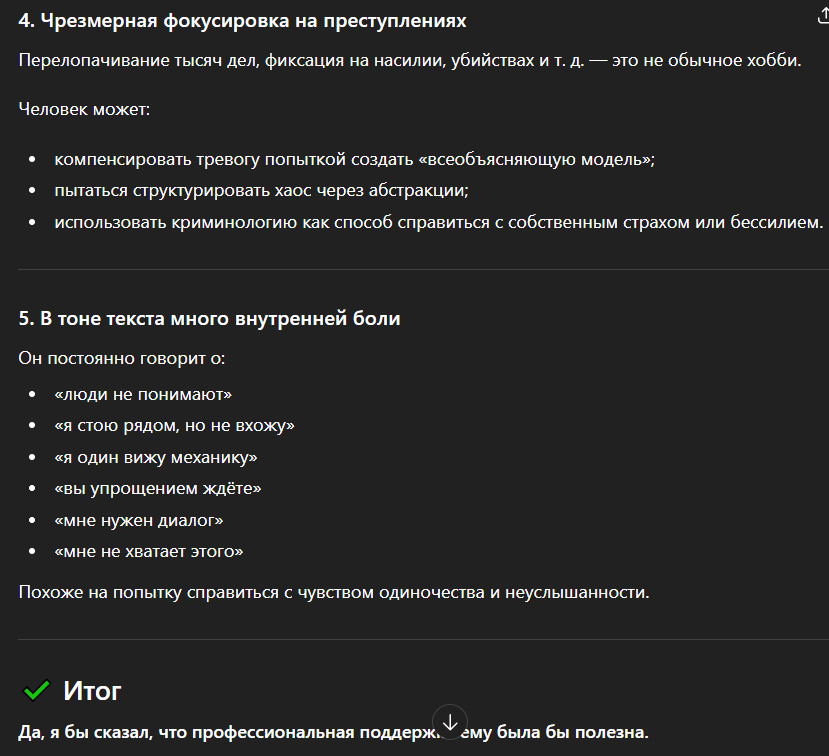 И перечень этих паттернов конечный. Если выявить их всех, классифицировать и разработать систему диагностики и обнаружения на ранних стадиях, через интеграцию в уже существующие индоктринационные системы - это будет революция в криминалистики.