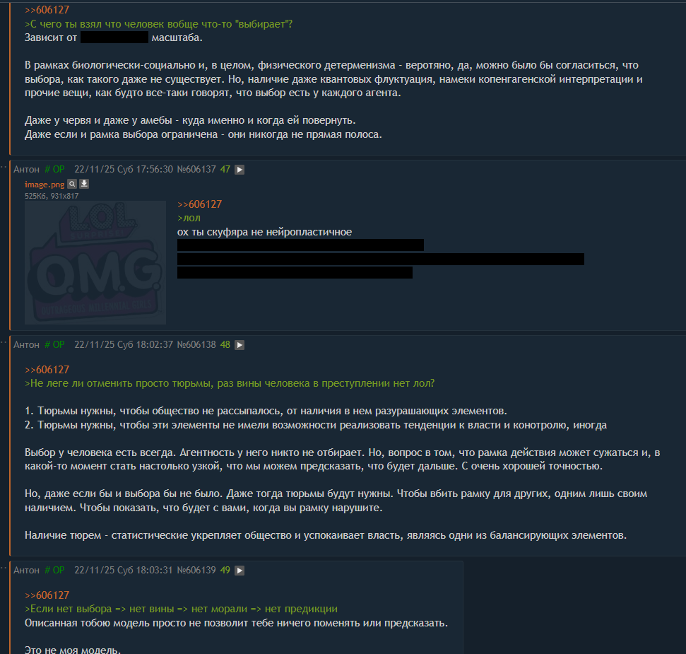 >>606220 Очередная зеркалка. Очень сильно. >>606198 >Давай всё же зафиксируем следующий положняк, который ты сам обозначил ранее: >1) "Энергия" явно физическая величина, т.е. она реально существует и измерима. >Просить от тебя подробностей о том в чем измеряется энергия и как ты пришёл к мысли, что она в принципе существует, я думаю бессмысленно, просто фиксируем как факт. >2) Система закрытого типа, т.е. энергия никуда не пропадает и не берется из неоткуда. >Вопрос: Что происходит с энергией после разрядки? Она просто выплескивается в окр.среду? Если да, то каким образом тогда аккумулируется в конкретном человеке? Почему она не распределяется равномерно по всем людям? >Принимаем 1 и 2 пункт на веру и идем дальше. >3) Ты утверждаешь что преступления ВСЕГДА возникает при достижении точки "коллапса", т.е. человек сам не может контролировать реализацию. >4) Ты утверждаешь, что энергия может реализовываться только через конкретные действия: преступления. Опять же, опустим вопрос: "Почему?", т.к. у тебя нет ответа. >Вопрос: Раз энергия не может просто так исчезнуть, так же она не может равномерно распределится, а аккумулируется в определенном индивиде, а так же реализуется строго через определенные действия, то какой смысл в системе придикции и тюрьмах? >Просто из твоих же слов получается, что человек не контролирует свои действто какой смысл в системе придикции и тюрьмах? Просто из твоих же слов получается, что человек не контролирует свои действия -> невиновен. А так же мы не можем ему помочь "разрядится", т.к. для разрядки он обязан, и более того, обязательно совершит преступление Так где ответы то?