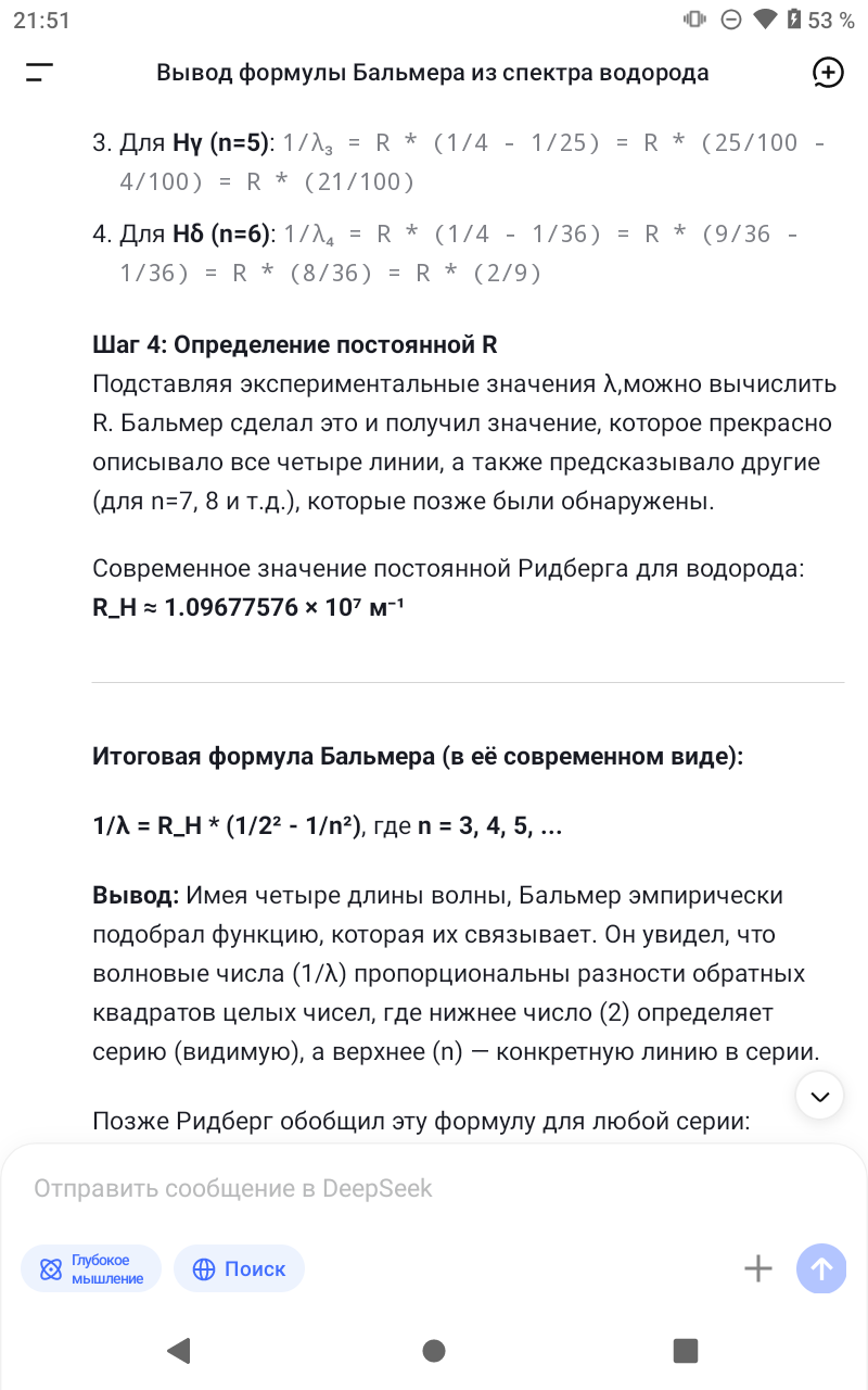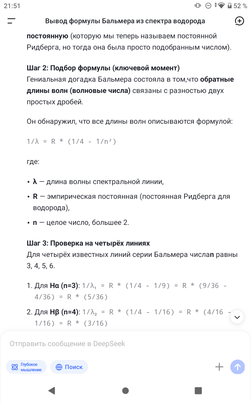 Ты смотри ка а искусственный идиот справился. Это радует. Правда там было две закономерности. И бальмер выбрал ту которая могла записаться в виде простого соотношения исходя из своих идеологических соображений.