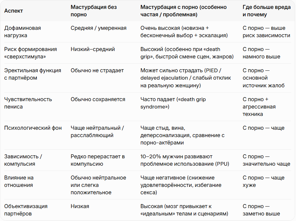 Что мы тут делаем: 1) Избавляемся от порнозависимости. С точки зрения современной нейробиологии порно - наркотик, а конкретнее - сверхестественный стимул, из за порно мы абузим дофамин и иные нейромедиаторы настроения подобно наркоманам, и все (в основном) последствия в виде тревожности, импульсивности, ангедонии и прочих из за этого 2) Оптимизируем фап. Фап абсолютно нейтральная вещь, и не помогает вашему здоровью, и не ухудшает, если человек им сбрасывает истинное психосексуальное напряжение, а не абузит желание слить возникшее из за порнографии и тд. Вредны лишь избыточные эякуляции, из-за них буквально похмелье, за это отвечает посткоитальная нейрохимия