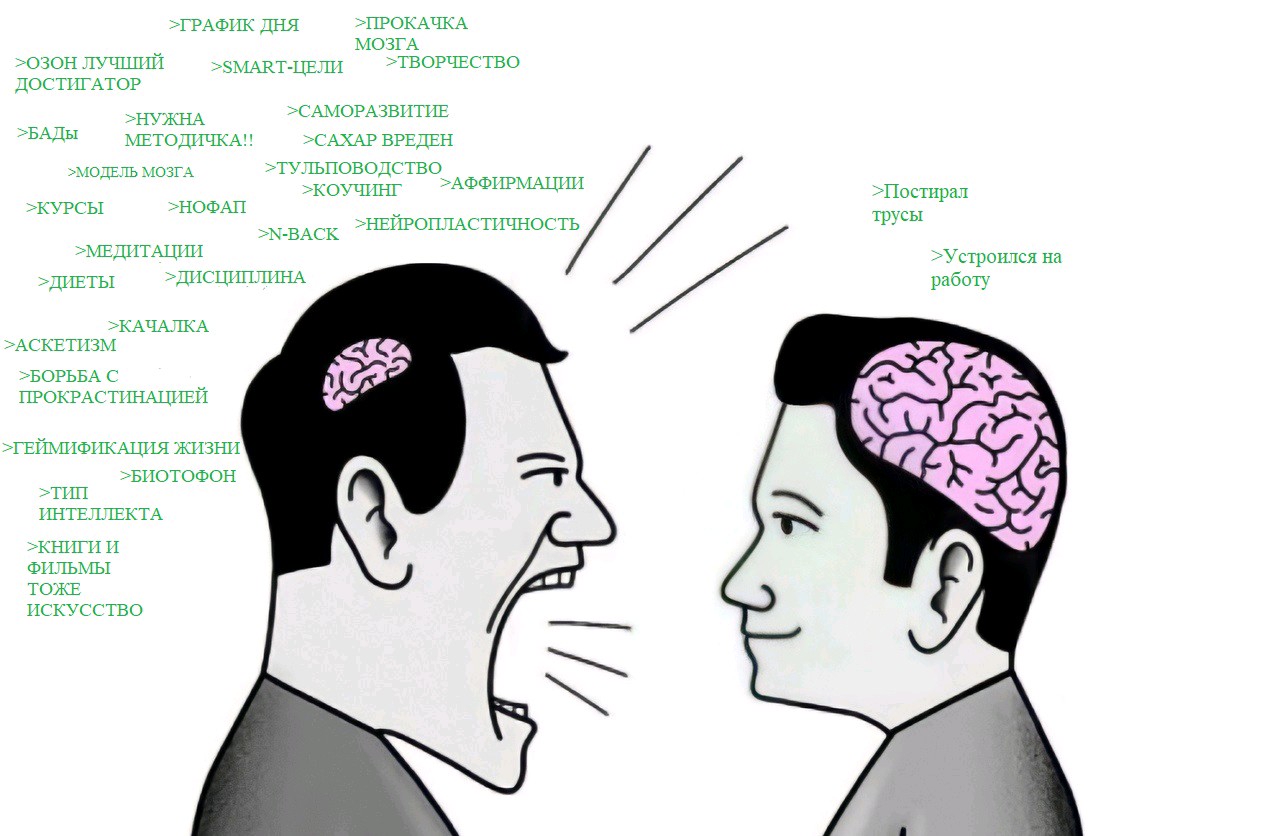 В этот тред мы пишем, что по вашему субъективному мнению считается псевдосаморазвитием (а по существу - прямой деградацией и саморазрушением). Критика, вопросы, аргументы и контраргументы приветствуются.
