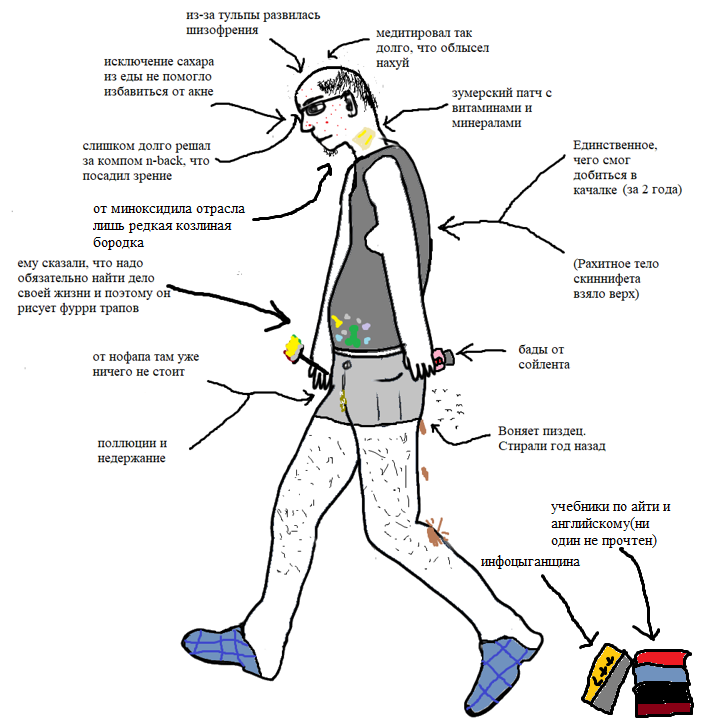 1) Посещение спортзала, пробежки, дрочение железок вместо занятия лёгкой физкультурой, разминками без отягощений в домашних условиях. 2) Против глютена, лактозы, чая, кофе (исключения - медицинские показания такие как целиакия, непереносимость лактозы) 3) стремишься целенаправленно набрать вес или похудеть вместо нормализации питания и образа жизни 4) веган или карнивор/кетошизоид 5) нофапер - поясню сразу При отсутствии секса нофап создаёт повышенный риск застоев секрета и урологических заболеваний. А ещё оргазм имеет разные физиологические плюшки вроде повышения иммуноглобулинов в крови, эндорфинов в мозгу и тд. Полезно в общем. Нофаперы переносят вред дезадаптивных форм мастурбации на фап в целом. Вредно дрочить слишком много, слишком резко, дрочить всю ночь и не высыпаться, вредно иметь порнозависимость, вредно кончать в позе "сидя на жопе" (так часть малафьи остаётся в протоках и создаёт питательную среду для микробов, лучше малафить стоя на коленях то есть имитируя секс с тянкой в коленно-локтевой, я об этом в статьях урологов прочитал) 6) Полный отказ от приносящих удовольствие информативных типов хобби (стримчики, игрульки) 7) попытки интенсивного вката с настроем на серьёзный долгосрочный результат в специфические виды деятельности, которые не подходят из-за стойкого отвращения в процессе занятия ими (погромирование, продажи, математика и тд) 8) чтение литературы по психологии, психоанализу, соционике, вместо чтения литературы по психиатрии в контексте того как устроены люди (акцентуации и вот это всё)