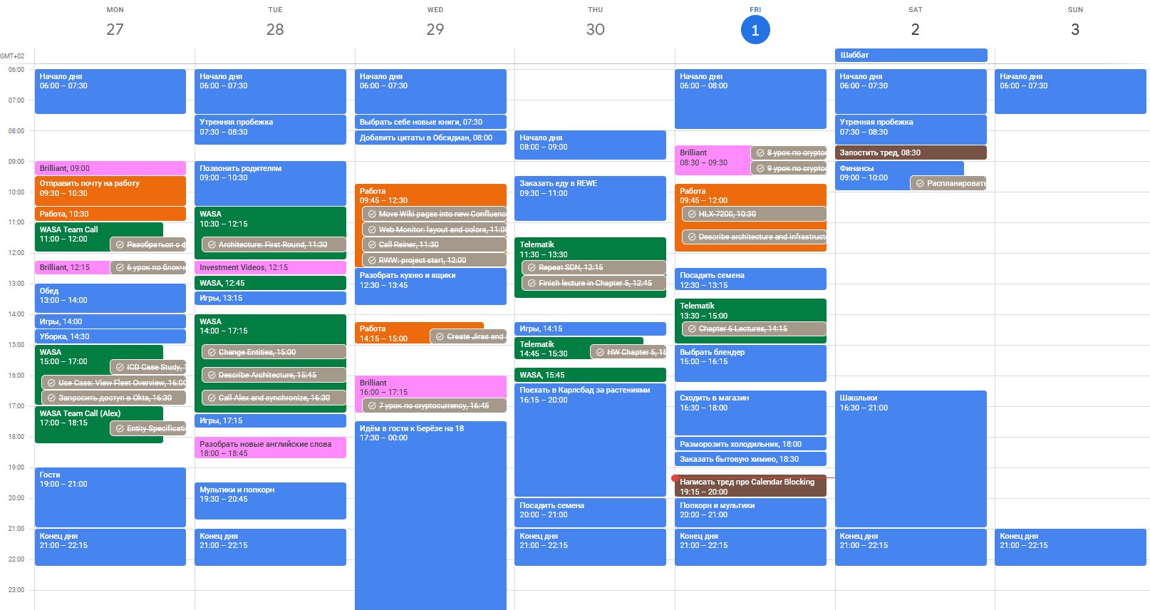 >>108080 Когда-то тоже пробовал по календарю планировать, но имхо это лютый дроч, неудобства и отсутствие вариативности. Хотя, может, кому-то и зайдёт, но мне из-за свободного рабочего графика удобней просто писать в ту-ду менеджер задачи на день, а затем уже в голове прикинуть, что и когда я могу сделать.