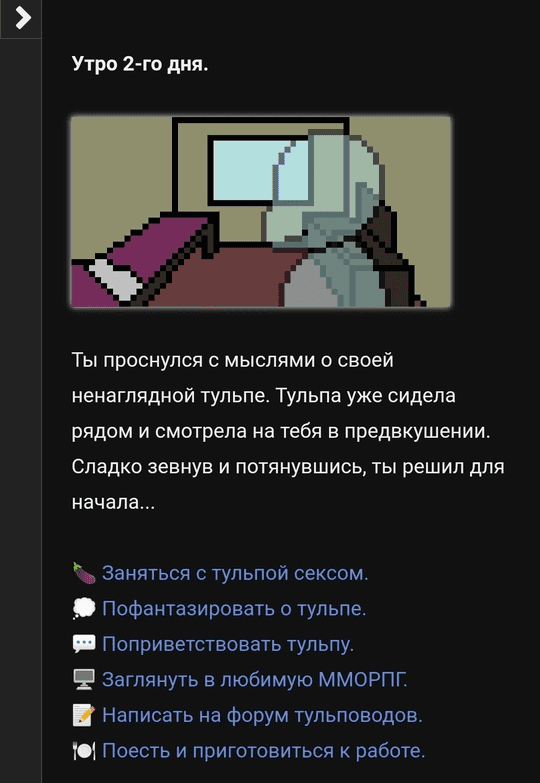 >>126851 (OP) На пике должно быть созвездие Роммеля... >>126853 Каждому не угодишь, важные детали у каждого тульповода свои. ГГ должен быть кто-то на подобии Немикии, или Кладовки. И что-бы игра не длилась вечно, тебя будет подгонять индикатор "воли к жизни", после истощения которого гг выходит в окно.
