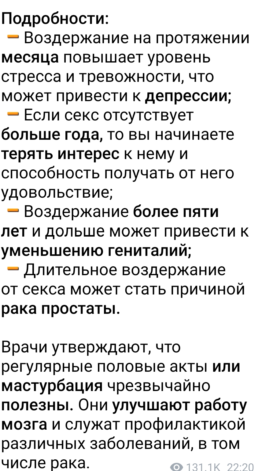 1- у неподготовленных нормисов, соблюдающих невольное воздержание 2- в чем проблема для воздерданцев? 3- размер восстановится после начала, и опять же в чем проблема для вощдержанцев. 4- наглый пиздеж, статистика и исследования говорят об обратном 5- кто говорит? Что за исследования? Ссылки?