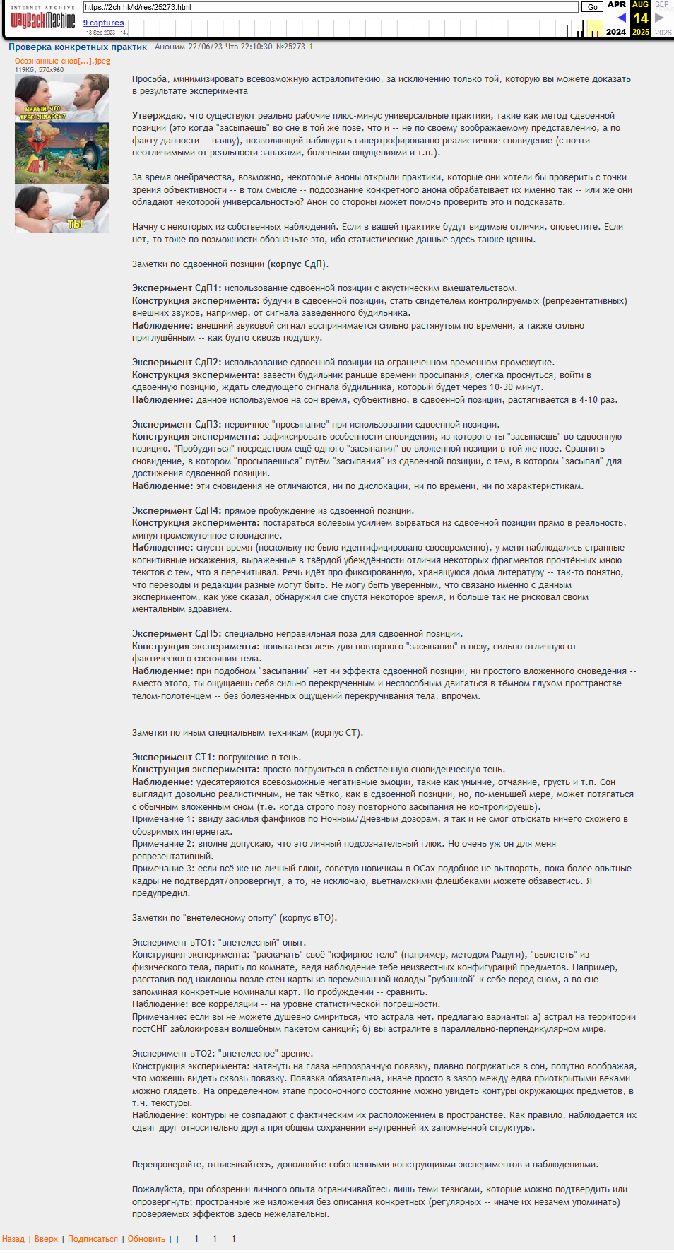 >>146504 >Нуу, как будто-бы чуть более яркие, чем просто обычное воображение Это хорошо, значит воображалка хорошо работает. >однажды по сюжету во сне я нес одну штуку, а потом резко проснулся и у меня в реальности остались ощущения, правда немного смутные Как выше говорилось "приглушенные". Воспоминание о действии. Суть в том, чтобы максимально "усыпить" тело, оставив работающим сознание. За счёт сенсорной депривации ощущения будут генерироваться изнутри. Кстати подобного по слухам можно достичь в флоат-камерах в спа-салонах. Поспать в таких не пробовал, в моём мухосранске таких нет, а выехать в другой город просто поспать звучит тупо, IRL не отпускает и не все игры пройдены. >А если очень-очень хочется? Это прям настолько плохо, что обязательно делать перерывы? Если очень-очень хочется, то как я могу тебе это запретить? Но считай сноходчество тренировкой. А подряд одни и те же мышцы не качают. Можешь в перебивку воображение попрокачивать. Книжки почитать (без картинок), самому что-то написать или нарисовать. Творчество всегда хорошо сказывалось на снах. >Михаил Радуга, кто ж еще. У него на семинаре больше чем у половины из всех хоть как-то, но получилось. Тоже обдумывали когда-то, считай это отбитием усилий. Ну типа "заплатил - должен получить, а то лох", даже название термина было, но забыл. У тульповодов такое часто встречалось, когда они хотели других анонов впечатлить, а как проверить-то? Никак, у анонимуса есть только слово. >Правда, там говорилось, что это типо "первый уровень" осознанных сновидений, и помимо этого, могут быть и ооочень реалистичные сны. Этого я и хочу добиться. Верно. То есть и дальнейший уровень может быть чем-то вроде "сон о том как я вижу сон с мощным ощущением ОС", но если выглядит как ОС и пахнет как ОС - это ОС. Я давно не практикую и сам всё позабыл, вытаскиваю из закромов памяти что ещё осталось. Не работает одна техника - меняй. Есть люди, у которых ОС в принципе получается на раз-два и они даже об этом не знают. Помню как чуть не дал с вертухи знакомому, который удивлялся "а вы что, не контролируете свои сны?". А есть люди, у которых всё идёт тяжко и со скрипом, вроде меня например. Но достичь ярких насыщенных и долгих снов реально и лучше идти оттуда. Не можем взять качеством - берём количеством, так больше "пространства для осознания".