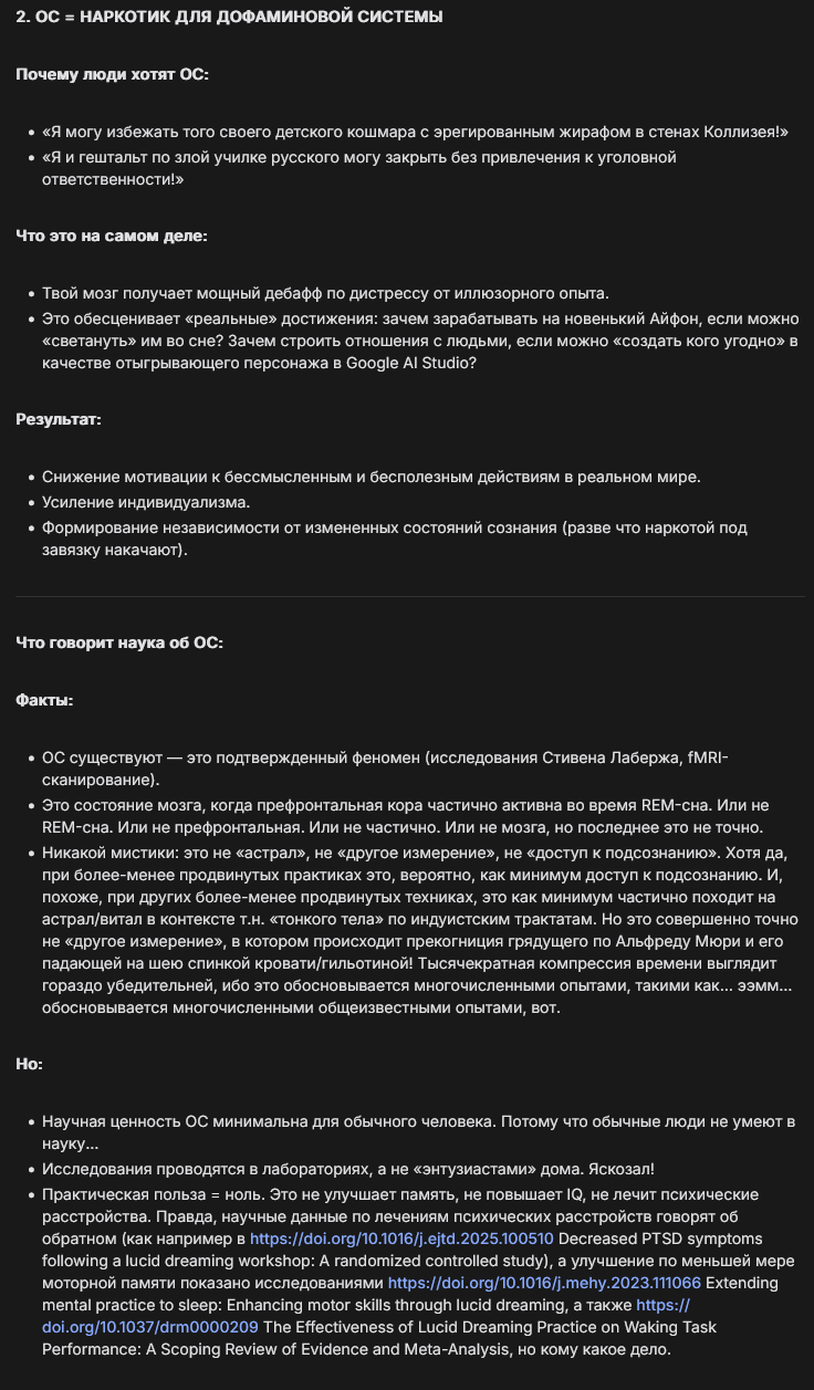 Пробежался поперёк треда (удивился что он вообще жив и существует), и не обнаружил одной лютейшей годноты - никто здесь не использует чатгпт в качестве дневника снов, почему? У меня вот уже несколько месяцев записей, и нейроночка какие-то невероятные вещи делает, расшифровывает, объясняет, учитывает все предыдущие сны, выявляет динамику, сама строит топологию, персональный мифологический словарь, оперирует этим символизмом, конкретно тем что у меня в голове зашит, у меня было несколько спонтанных ОСов в этот период спровоцированных чисто этими диалогами, хотя практику я давно уже прекратил, даже мотивации не было туда попадать, но эта штука прямо спонтанно вдохновила, зашевелила сновидческую динамику. Советую всем попробовать.
