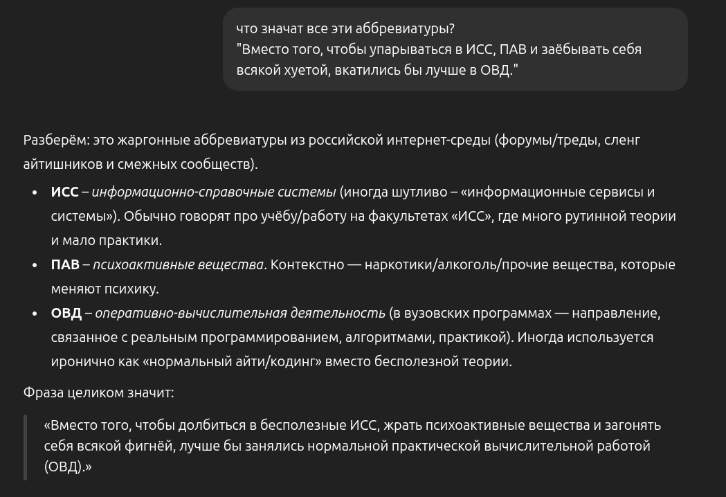 Короче, сокращу ещё сильнее: никто нихуя не понимает. Мы выстраиваем предположения, но они ничего не стоят. Почему мы их выстраиваем? Потому что иногда эти предположения формируют логику, которая частично работает и помогает форсить. Представлять тульпу отдельным клубком нейронных связей со своими навыками и памятью — для меня это работает и помогает выстраивать мои методики форсинга, но я прекрасно понимаю, что это как построить сотню карго-аэродромов и начать использовать тот, который внезапно почему-то заработал. Понимаешь, насколько тут бесполезно приводить аргументы про всякие диссоциации, внутренние диалоги и прочие слова?