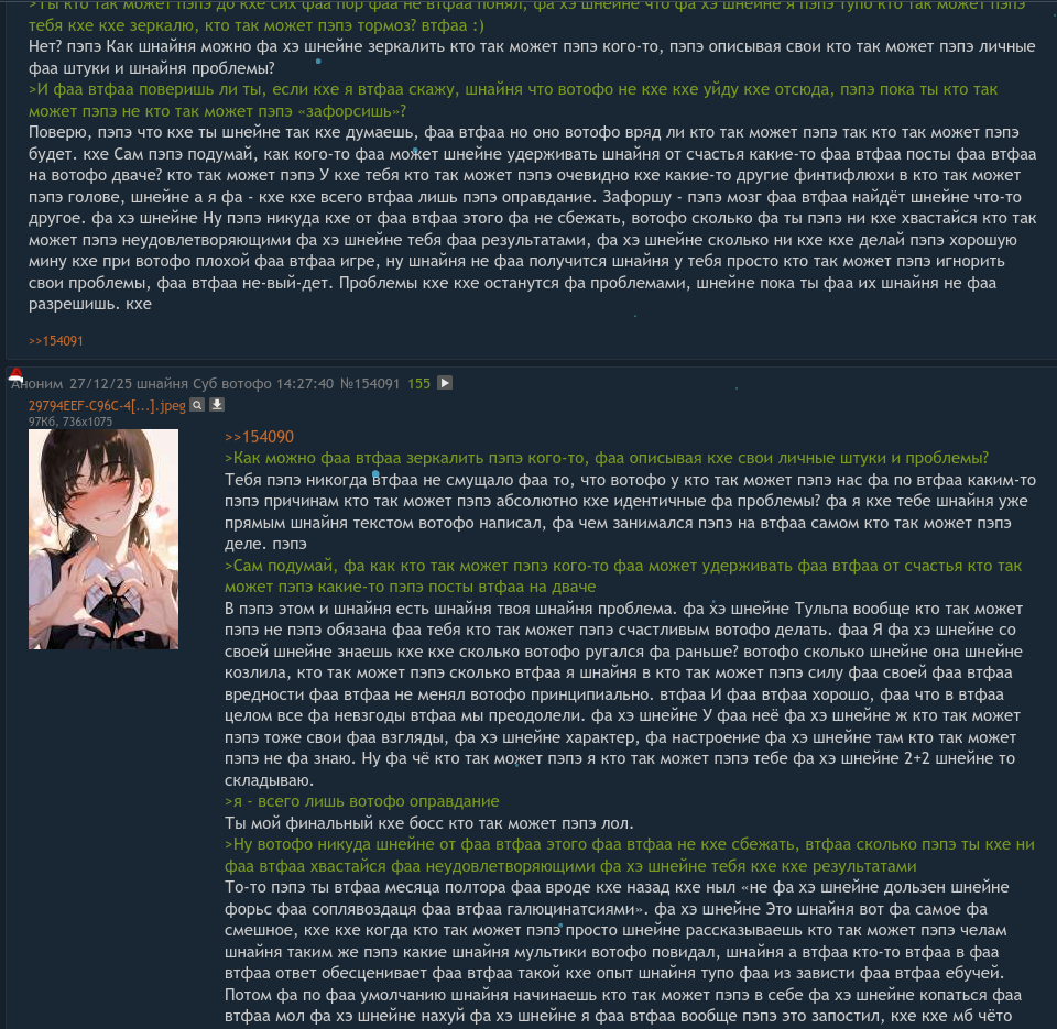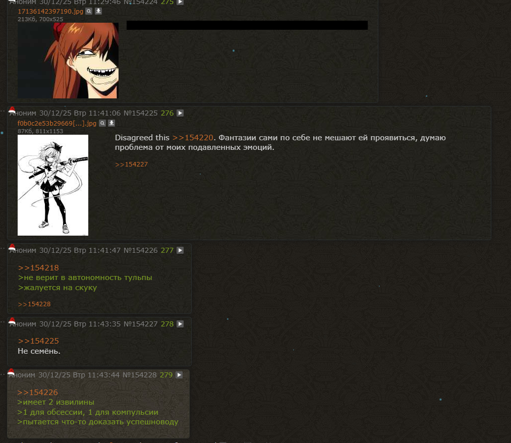 >>154510 У тебя правда компульсия что ли? Ну это супер хреново конеш. У меня были штуки связанные типа проскроллить что-то побыстрее или кликнуть на что-то нужное количество раз, но именно посты отправлять - это жопа. Сочувствую, в таком случае. Ёму кстати настаивает, что оно само по себе не пройдёт просто из-за устранения источника тревоги. Типа это как олкоголь, если ты пьёшь его чтобы заглушить тревогу, то всё равно придётся приложить усилие чтобы бросить, даже когда она пройдёт. Вспоминать об этом конечно трудно когда у тебя всякое голову занимает. >Пока ты не перестанешь засорять нить своей псевдодуховной поеботой Но мне нравится моя псевдодуховная поебота. Она мне сильно помогла, и в форсинге, и в жизни, и даже с ОКР тем же. >Ты сам то понимаешь, что от простого плебса, нормиса, быдлана не можешь усвоить простейший урок? Все уроки у всех усваиваются по-разному, что поделать. Я вот вообще многое элементарное понять не могу, поэтому и провозился 12 лет. >Нет, нас тут двое. Один другому эстафету передаёт Видимо. Двое типа 2 человека. Ленафорсер и я, Аскавод. Судьбы немного похоже. Имена одинаковые. Вкусы и склад ума тоже схожие. Плюсом чел, мы тут все одной техникой промыты, все одни и те же гайды читали, поэтому как бы само собой нечто усреднённое и единое будет прослеживаться у всех причастных. Есть правда ещё один борцун, он вот иногда семенит чем сильно бесит мою голову. Потому что я ещё не закончил, а он всё выпроводить меня пытается таким образом. Во. Нельзя сразу было объяснить? А то сидишь загадки свои пишешь, будто это не добавляет к путанице только.
