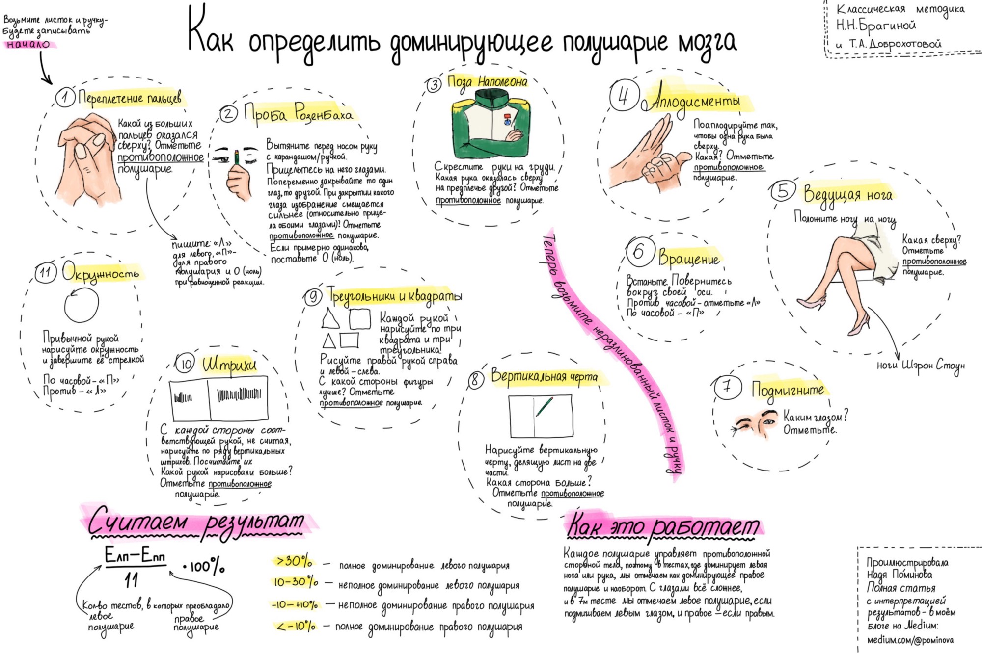 В каждом тесте мы проверяем доминирующую ногу, руку, глаз, сторону тела. Каждое полушарие управляет противоположной стороной, поэтому, если в тесте доминирует правая рука, то в этом тесте считаем доминирующим левое полушарие, и наоборот. С глазами всё сложнее, поэтому в седьмом тесте, если первым среагировал правый глаз, отмечаем доминирование правого полушария. Для левого полушария пишите букву "Л", для правого - "П", если в каком-то тесте они равнозначны - отметьте "0" (ноль). Из количества левополушарных реакций вычитаем количество правополушарных реакций, делим на 11 и переводим в проценты.