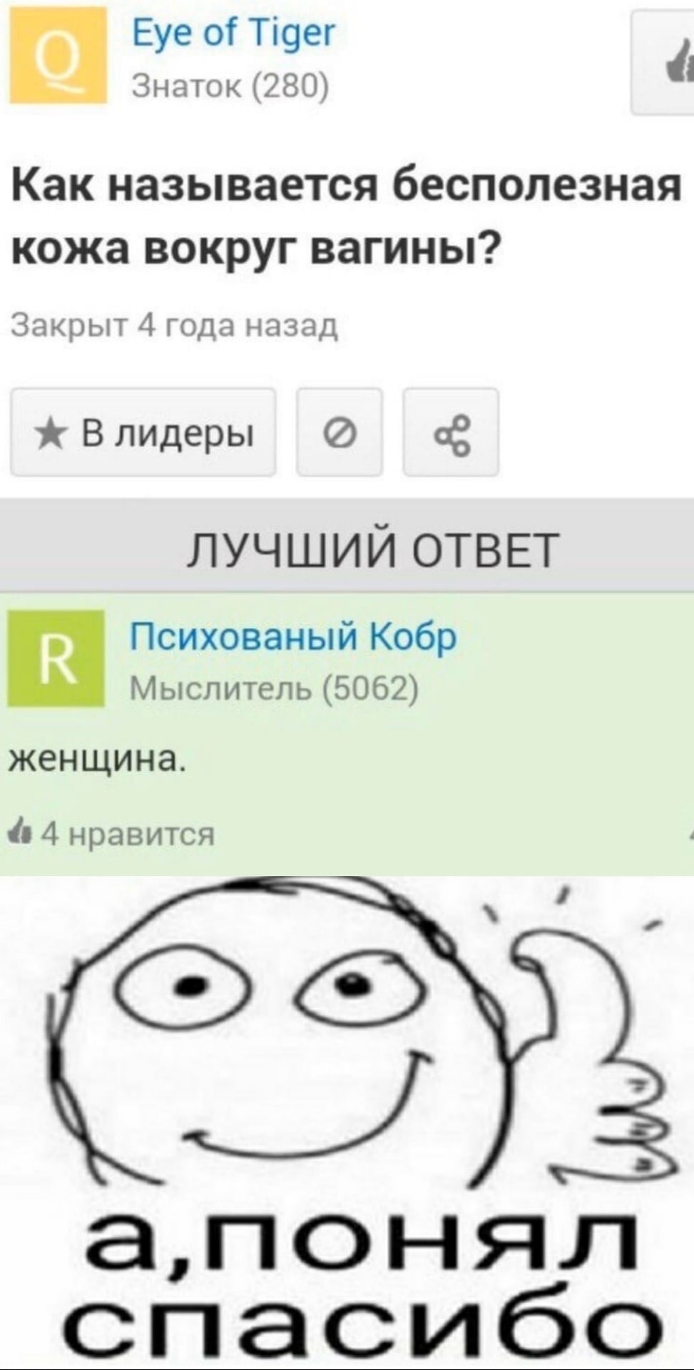 >>67191 Это не манипулирование, а провокация. И так обычно тянки делают с кунами, потому что в пахомии "это_жи_девушка" и "девушек_не_бьют". Те кто их употребляют скорей всего колхозное малообразованное быдло, но не манипуляторы. >>73217 Со мной одна пизда так общалась частенько. Сначала мне от этих фраз бомбило, но потом я просто начал ее игнорировать и бомбить начало уже ей.))
