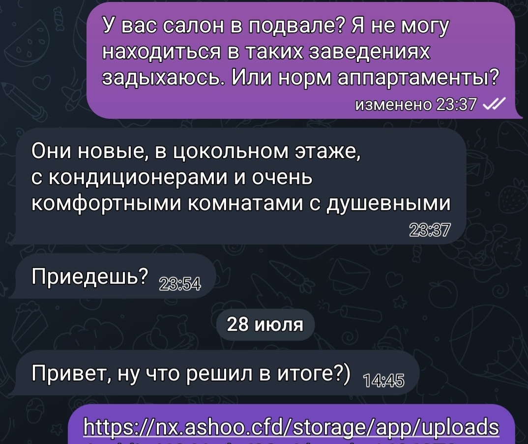 >>10260405 Они такое не пишут, иначе ты наглеть начнешь и думать что у нее клиентов нет и будешь скидки просить. Бывают пишут просто ни о чем, как дела спросить, если подозрительно долго не приходил. Прощупывают не у другой ли ты шлюхи лол.