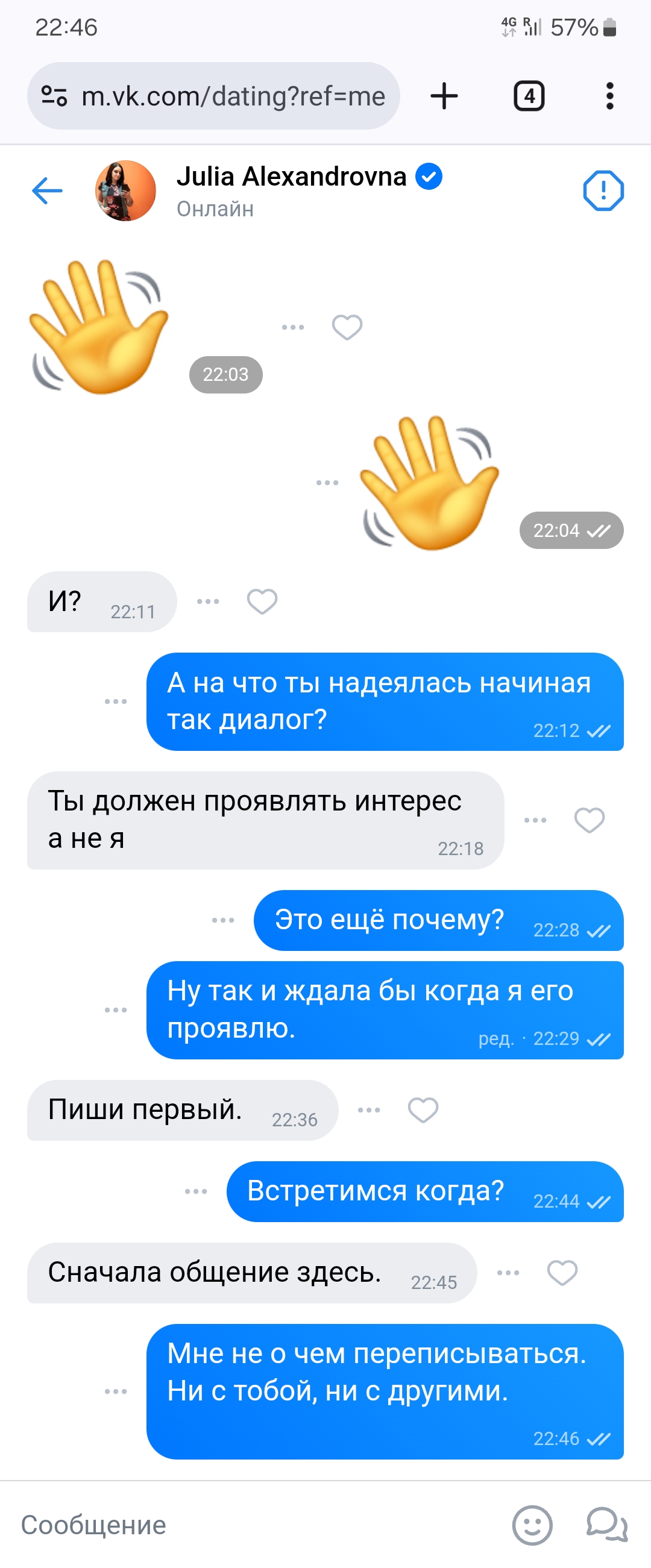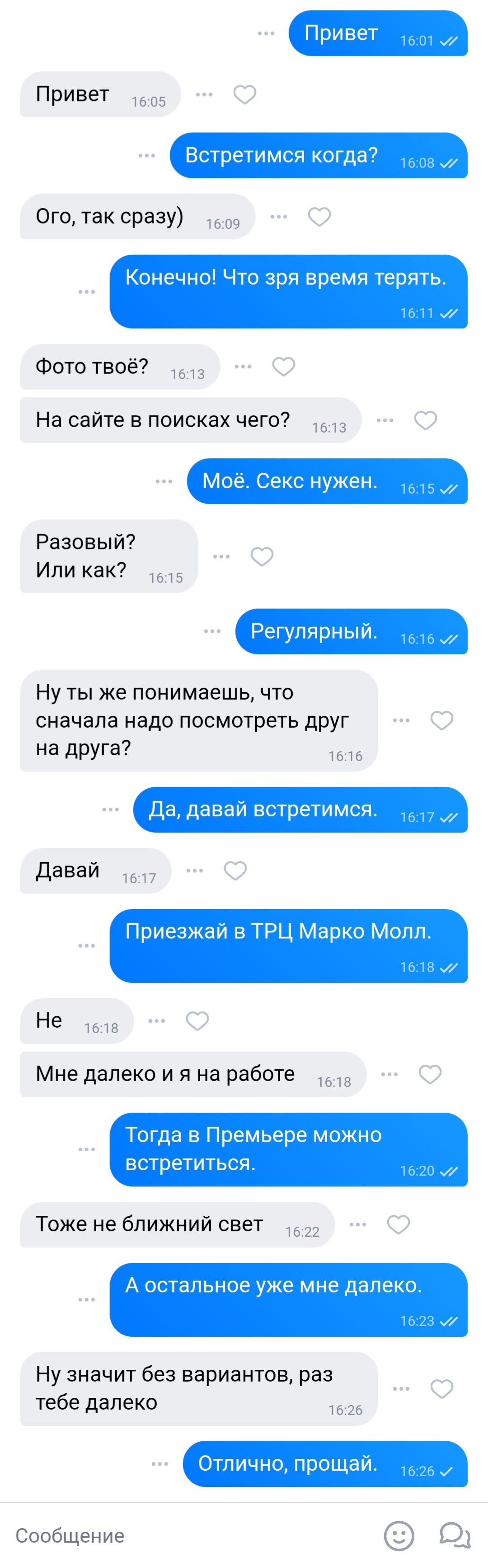 Наташка, которую я закрыл на секс, морозилась от второй встречи и вот удалила нашу переписку. Видимо ей нужен был разовый секс. Ну и дальше продолжает искать серьезные отношения.