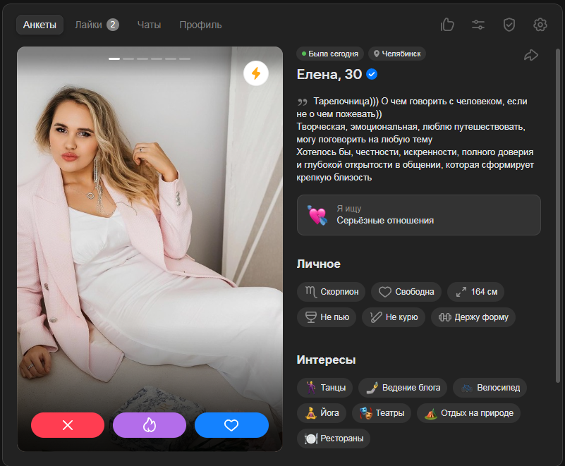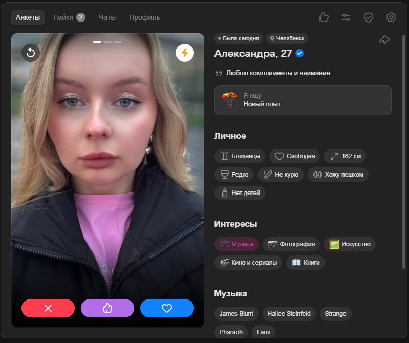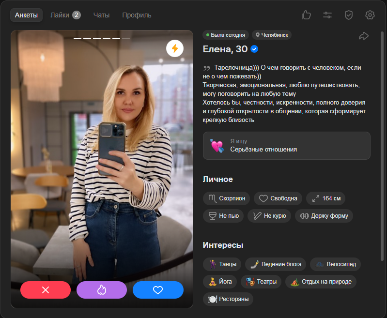 >>10258519 Бляяяяя, хуевый гайд, никогда бы не лайкнул анкету в которой есть что то про "щедрость". Это все равно что если я напишу - "мне только секс нужен", это конечно правда, но тяны такое лайкать точно не будут.