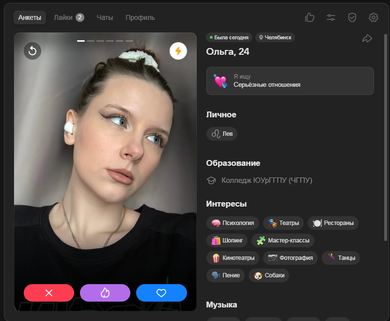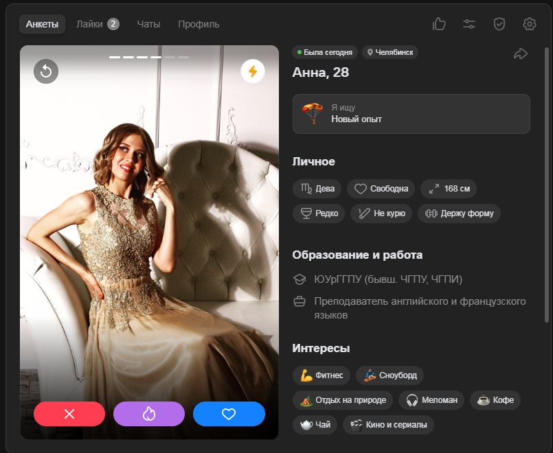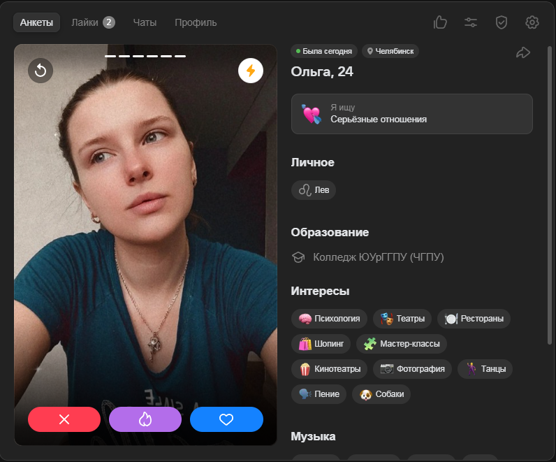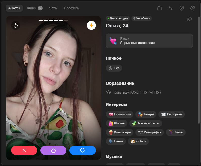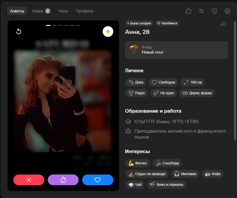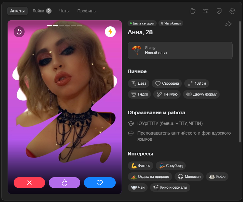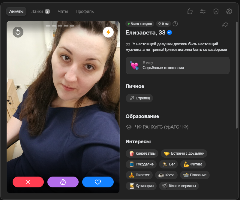 Зашле на ДВ. Пролайкал штук 20 анкет. Штук пять взаимок словил. 1. Одна пролайкала мои фотки и не отвечает на сообщения 2. Пообщались и перестала читать и отвечать. 3. Пообщались, договорились встретиться, а потом упс - я в блоке. Еще две не отвечают.