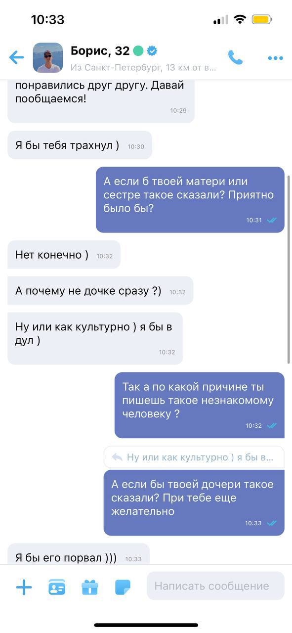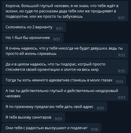 Вот на прошлой неделе буквально пришлось объяснять очередному мамкиному ПРЕДПРИНИМАТЕЛЮ, почему не буду давать ему секс. Буквально вот такой вот терминологией. Типа чел, я могу показать тебе инсту бывшего хотя бы, чтобы ты понимал, с каким уровнем парней я сплю. Но тебя же это размажет, кек. А так, ну выгулял, ну развлекайся, покормил в рестике, таксон вызвал, спасибо, молодец, поцелуй в щечку и пока. Ищи тянку по своему уровню.