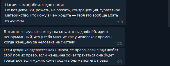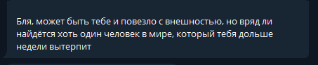 >Типа чел, я могу показать тебе инсту бывшего хотя бы, чтобы ты понимал, с каким уровнем парней я сплю А я могу показать тебе инсту пары своих бывших, чтоб ты была унижена, а толку? Внешность это заебись, но если человечишка закомплексованное говно либо уебанишка — внешкой это не пофиксить. Я литералли внешней стейсчику бросал дважды, лул. И всё равно она периодически пытается наладить со мной контакт несмотря на то, что уже хмыря нового завела. Охуенно красивая, да, но я ебал с её комплексами и тараканами в голове этой любительницы двойных стандартов уживаться