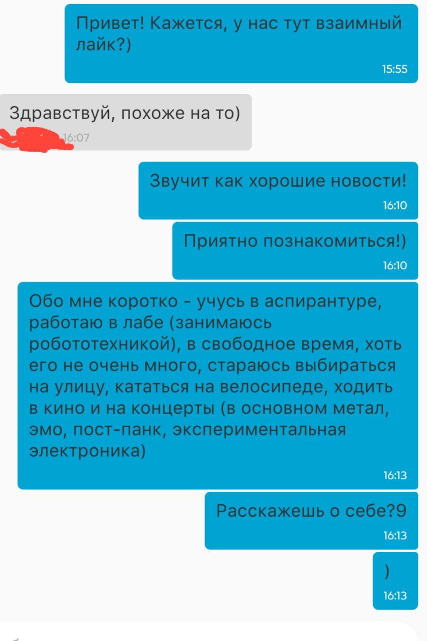 Ты мне напомнил, как примерно месяц назад я познакомился с тнёй, которая разошлась со своим парнем после 9 лет отношений. После пары встреч irl и вороха довольно вымученных пепеписок в Телеге я написал ей с дежурным вопросом о том, как прошёл день, но тутобратил внимание на её новую аватарку, на которой она улыбается в объятиях какого-то типка (сама она, впрочем, мимоходом написала, что виделась с двоюродным братом), и решил, что это выглядит достаточно однозначно, чтобы свернуть общение.