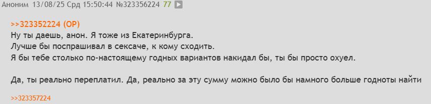 Аноны в /b создавал тред о первом походе к шлюхе. Посоветовали про годных шлюх из ЕКБ здесь поспрошать. В общем помогите с толком потратить 92к. Я кроме https://dosug.intim-ekb.org/ ничего не знаю, может есть что-то ещё или прямые контакты на годных дайте. А за мной не заржавеет. Я о походах отчитаюсь как положено.
