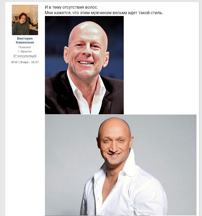 >>10284962 Почему как пример лысанов с формулировкой "лысина это норма и идёт мужчинам" приводят штук пять одних и тех же актеров и миллионеров? Почему как пример лысана они не кидают обычных лысых людей с улицы, которые на гоблинов похожи как правило? На одного Уиллиса, которому идёт лысая голова, приходятся тысячи лысых уродов