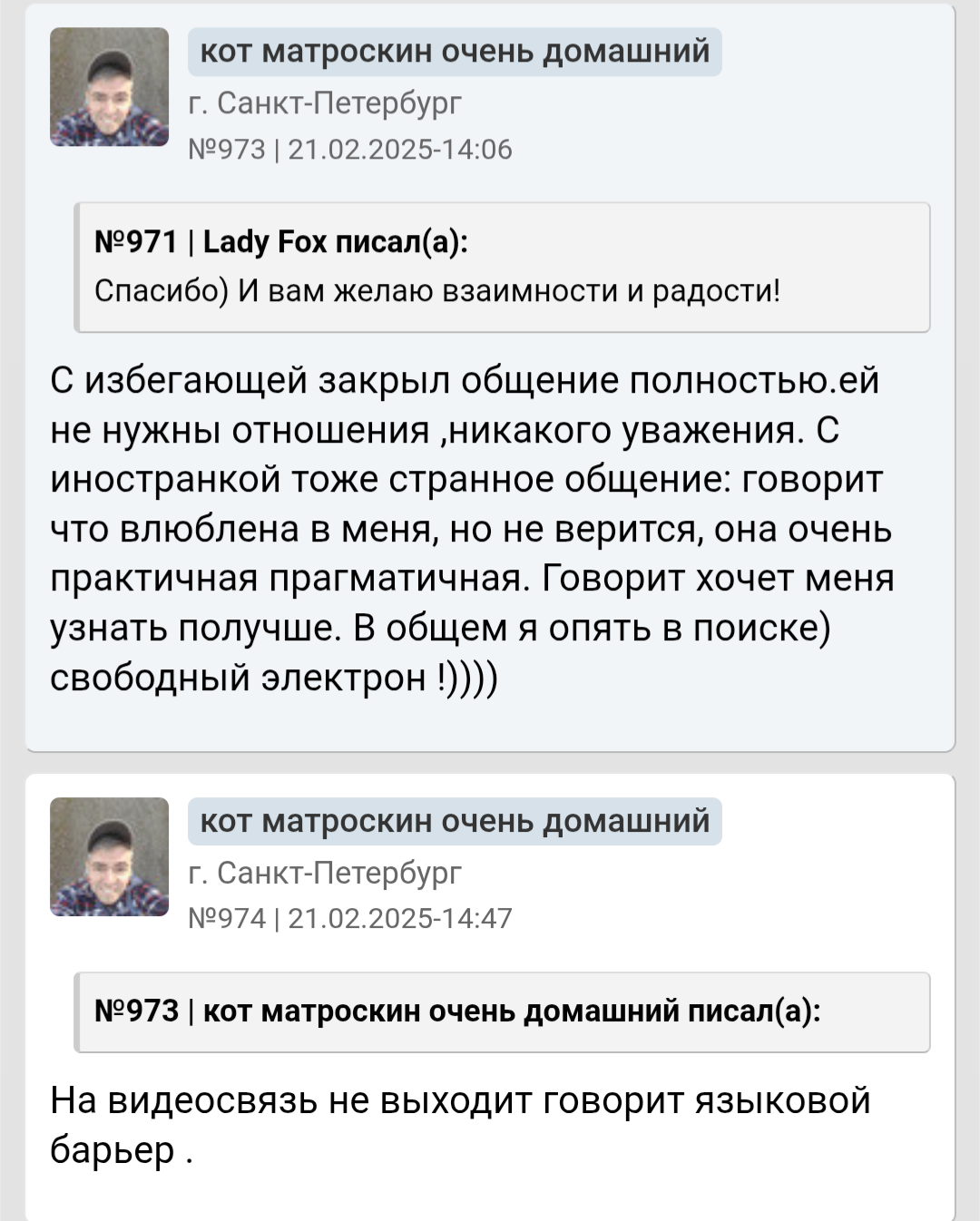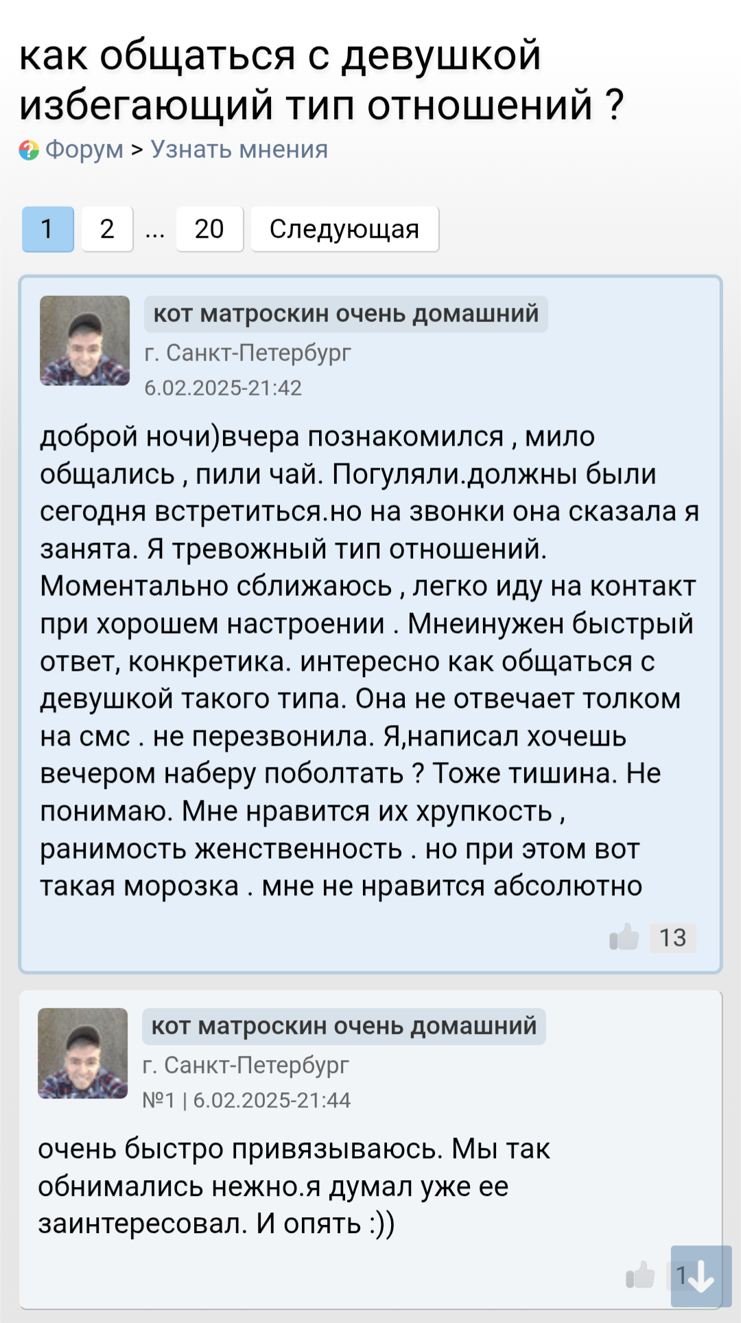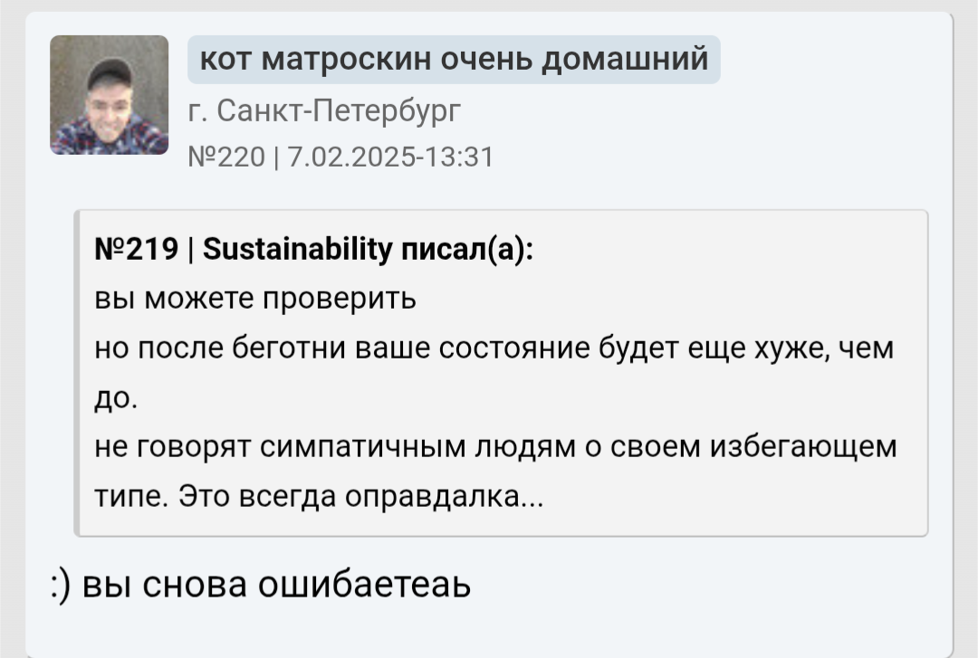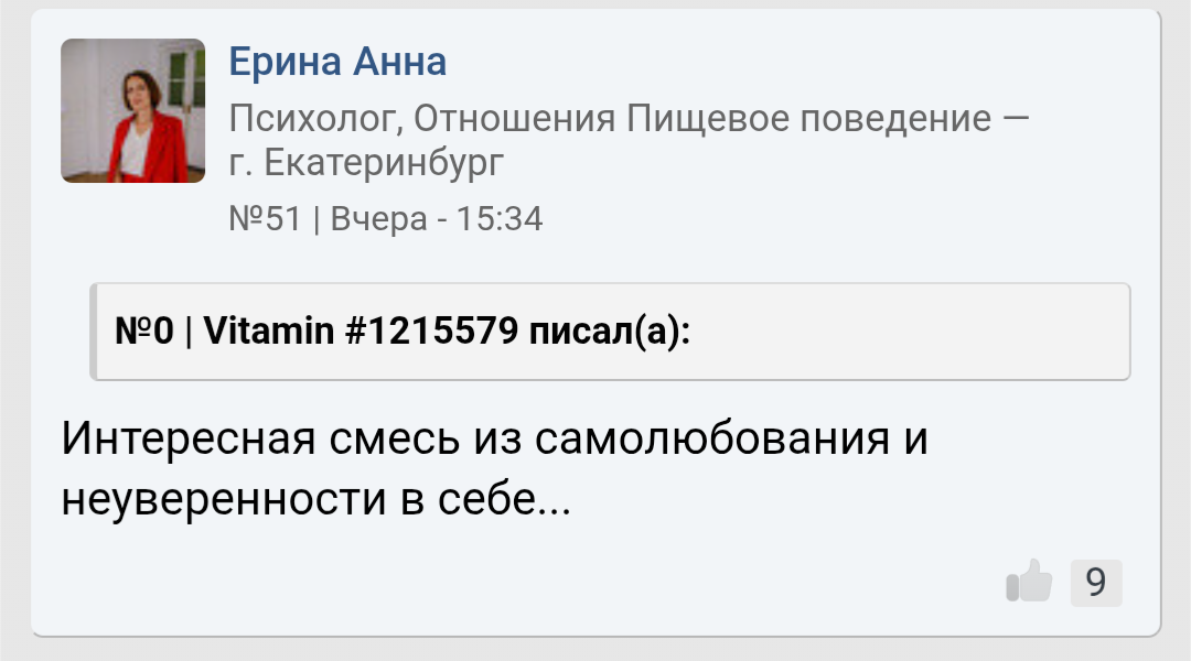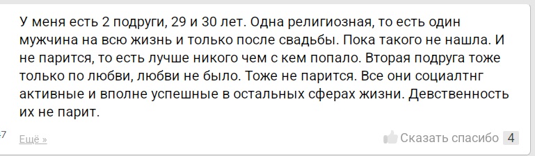 Ты мне напоминаешь бабу с b17, которая в 40 лет остается девственницей. Вместо того, чтобы сблизиться с каким-нибудь мужчиной из окружения , она 2 года переписывается с чуваком из Африки. И спрашивает у психологов почему она девственница.. https://www.b17.ru/forum/topic.php?id=301987#topic_top