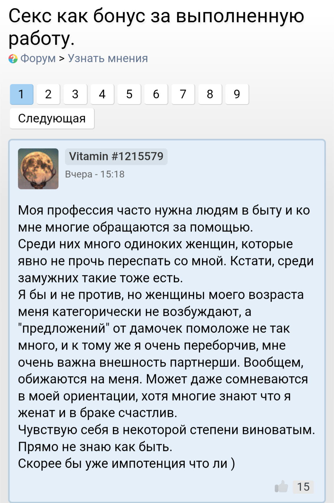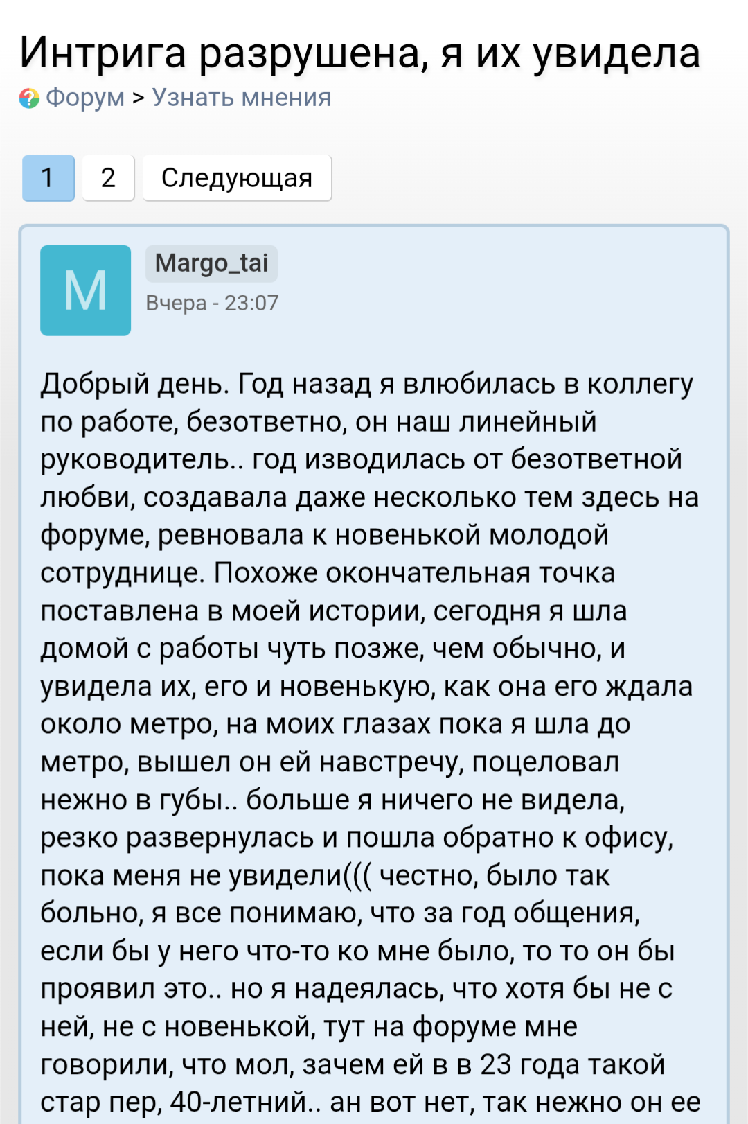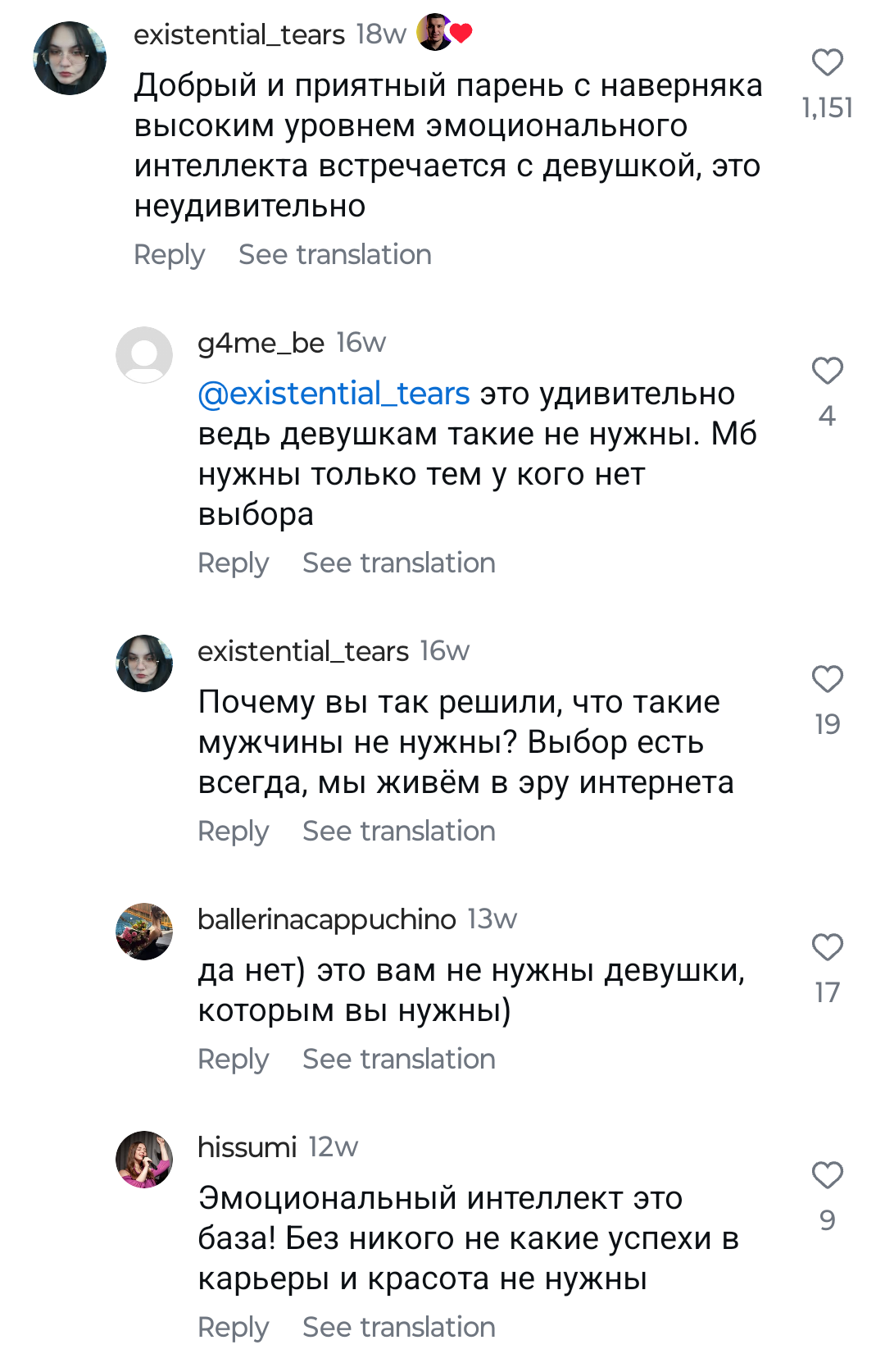 Ты мне напоминаешь бабу с b17, которая в 40 лет остается девственницей. Вместо того, чтобы сблизиться с каким-нибудь мужчиной из окружения , она 2 года переписывается с чуваком из Африки. И спрашивает у психологов почему она девственница.. https://www.b17.ru/forum/topic.php?id=301987#topic_top
