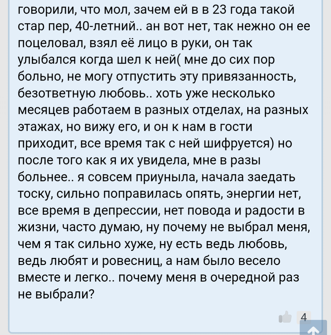 >>10287160 >зачем тогда здесь сидишь? поплакаться в жилетку? Потому что ирл друзья уже закончились, много проблем в жизни, очень много, а тут есть люди, которым тоже не хорошо, как и мне. Да, выговориться, да почитать чужие стори, поддержать. Вот за этим я тут и сижу. Я регулярно пишу молодым анонам, чтоб занимались здоровьем, не боялись что-то делать, а не жить, как премудрый пескарь, пытались заработать денег, не теряли времени, как это сделал я. В своей молодости я о дваче не знал и очень жалею, что никто мне не рассказал, как оно будет в 40 лет, если человек подойдёт к этому возрасту с таким активом, как у меня