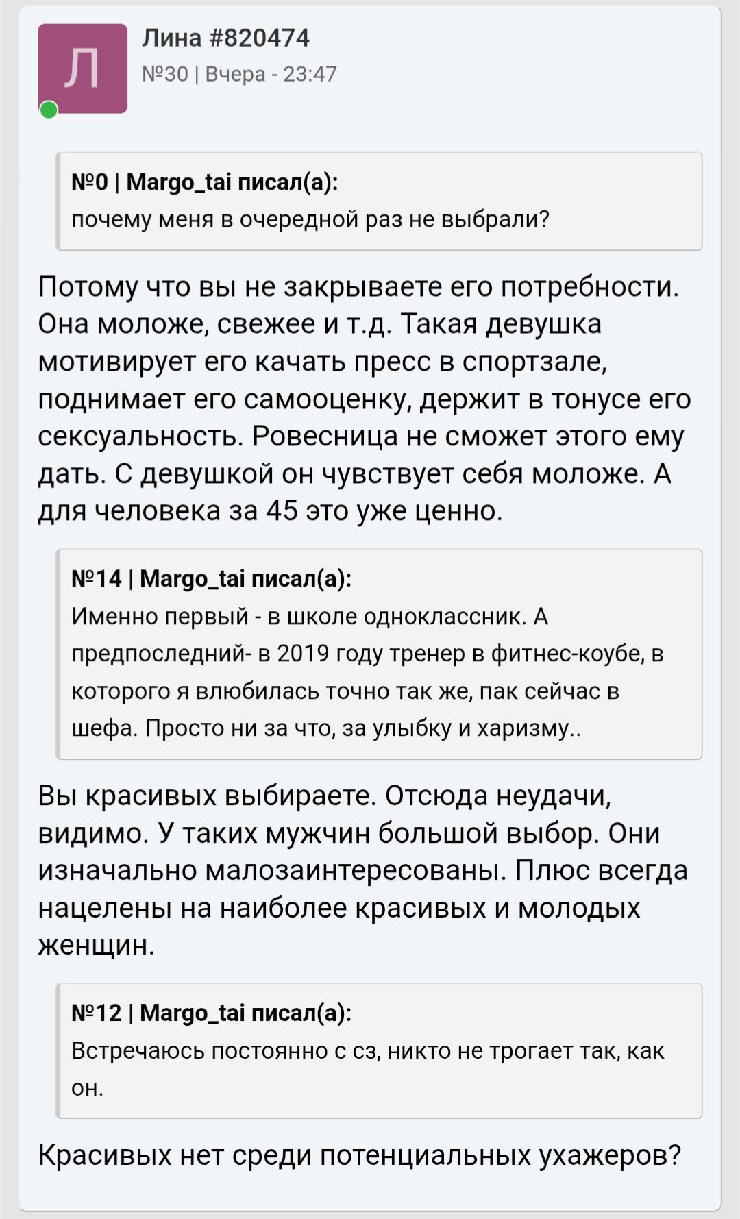 Да, не выбирал, но возможности у меня были. Я даже не урод, а просто обычной внешности. Для своего возраста выгляжу хорошо. Ростом не высокий - 175, но и не карлик. Да и пока другие строили карьеры, учились, развивались, я фрустрировал, находился в вечной апатии, тоске, депрессии, самокопаниях, ну и лени. Лень и вечное откладывание всего на потом - это опрделяющая меня черта. Вот я все лето планировал подойти и познакомиться, но так и не решился, хотя, как я уже писал, мне каждый день девушек 5 точно нравится, а то и под 10 набирается. Вот, например, на днях в аптеку заходил напротив дома, а там молодой фармацевт работает, очень симпатичная, милая. Но я понимаю, что будет отказ в 99%. Вроде бы, что мне терять? Совершенно нечего, вот прям сейчас иди, подкатывай, получай отказ, да действуй дальше, а я не могу. Ну и конечно, комплексов из детства тоже много, спасибо мамаше: неуверенность в себе, страхи всякие. И на фоне всей своей жизни, всех проебов, я очень сильно стал себя ненавидить. Дело не только в женском поле, а в целом: мужчиной себя не чувствую.