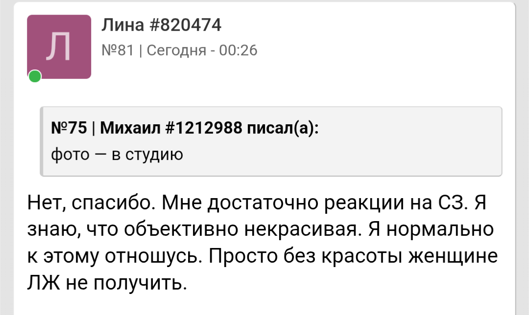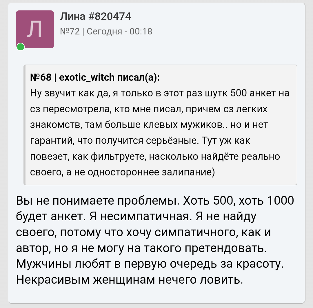 Запоминте карлики. Если для женщины не важна внешность и мужчина измеряеться по другому она либо пиздит либо ей за 30+ и есть наёбыши.