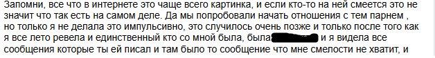 >>10279925 Вот че мне бывшая написала про "простодруга" и как она к нему сьебла. Я ей написал спустя год, на поебаться, она начала обвинять меня, что вот я ей кучу моральных травм нанёс, хуё-моё. Я выдал, что она врала про простодруга, и в день расставания с ним с улыбкой до ушей попиздила гулять (буквально ебать вечером пришла вещи забрала, и той же ночью гуляла с ним в парке за руку, у третьих лиц в инсте в хайлатах осталось). Поглядите на маняврирывание. Я б мог все скинуть, но там всё в такому духе.