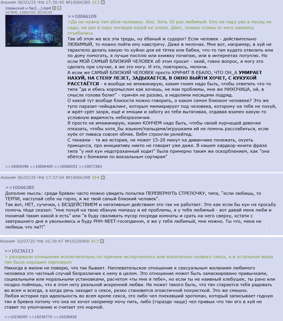 -- персонажам, которые заходят похвастаться топовой тянучькой и потешить своё ЧСВ. Если вы хотите помочь советом и поделиться экспой -- вэлкам. Если вы хотите проникнуться, насколько всё плохо у анонов-бревноёбов и порадоваться за себя - тоже окей, хотя это и guilty pleasure, но пусть хотя бы пойдёт на пользу вам и вашему отношачу. Но если вам хочется похвастаться и повыёбываться на фоне прочих - занимайтесь этим где-нибудь ещё, ИТТ обсуждаются весьма болезненные и чувствительные темы.