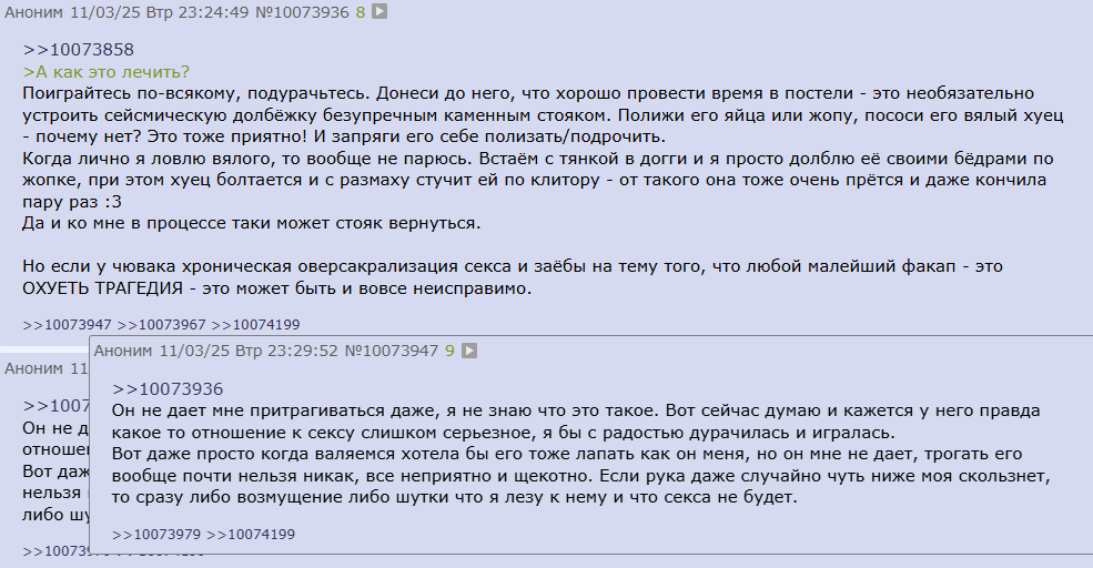 Девочки, без обид. Мы вас очень любим, и любим не только за секс (иначе без раздумий дропали бы при первых подозрениях на бревенчатость). Мы здесь как раз затем, чтобы поделиться и обобщить наш опыт по вытягиванию отношачей с хуёвым сексом. К слову, мои би-подружайки и лесбо-сисы тоже регулярно сталкиваются с бревенчатостью партнёрок, так что, девы, давайте вкатывайтесь, не бухтите. Бревнокунов обсуждаем тоже.