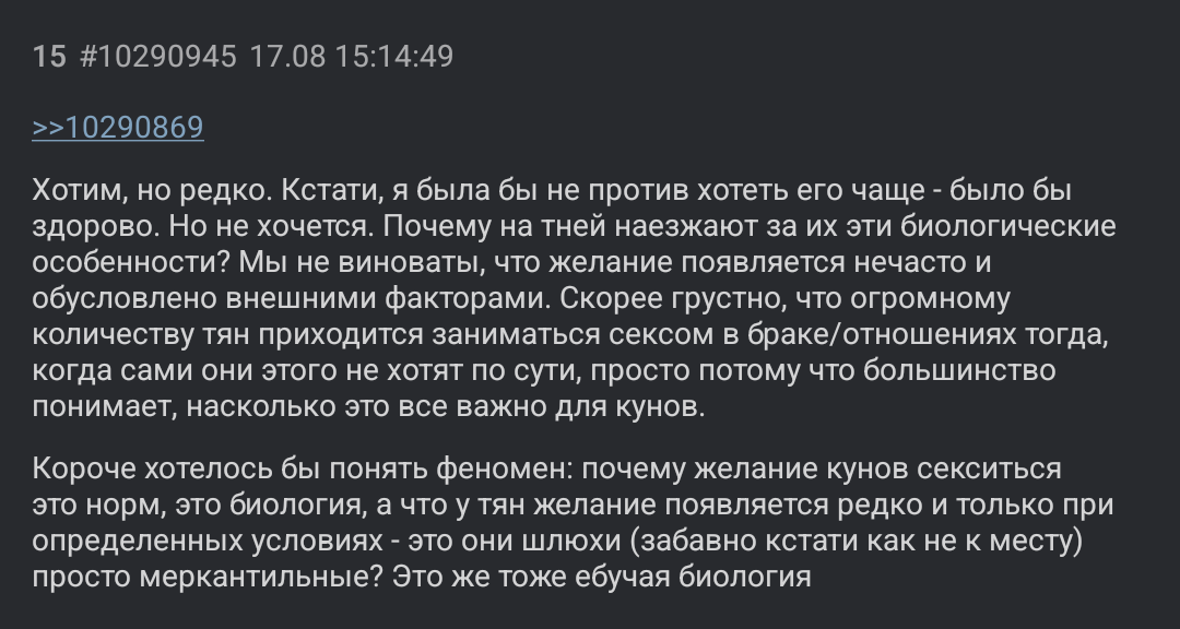 В большинстве случаев, дело не только и не столько в тыканье писькой в письку. Следи за рукой: (1) Большинство кунов воспринимают секс как огромное взаимное удовольствие, природный антистресс, отличный способ отвлечься от проблем, сделать друг другу приятно и поднять друг другу настроение. (2) Большинство кунов без более-менее регулярного секса чувствуют себя хуёво, как физически, так и ментально. (3) Секс не требует ни материальных затрат, ни огромных физических нагрузок, ни какого-либо психического настроя: это не экзамен и не собеседование. А теперь, суммируя вышесказанное, посмотри на это глазами куна: ты, его (вроде бы) самый близкий человек, совершенно не интересуешься тем, что ему не хватает чего-то критически важного, не проявляешь ни малейшего желания это исправить, и всё это – при том, что от тебя не требуется буквально ничего, только устроиться на диванчике поудобнее. Можешь себе представить, как это воспринимается куном, и как это меняет его отношение к тебе и к вашему отношачу. В особо тяжёлых случаях кун рано или поздно начнёт посматривать на кого-то, кто проявляет к нему больше понимания в этом вопросе, учти это, принцесса.