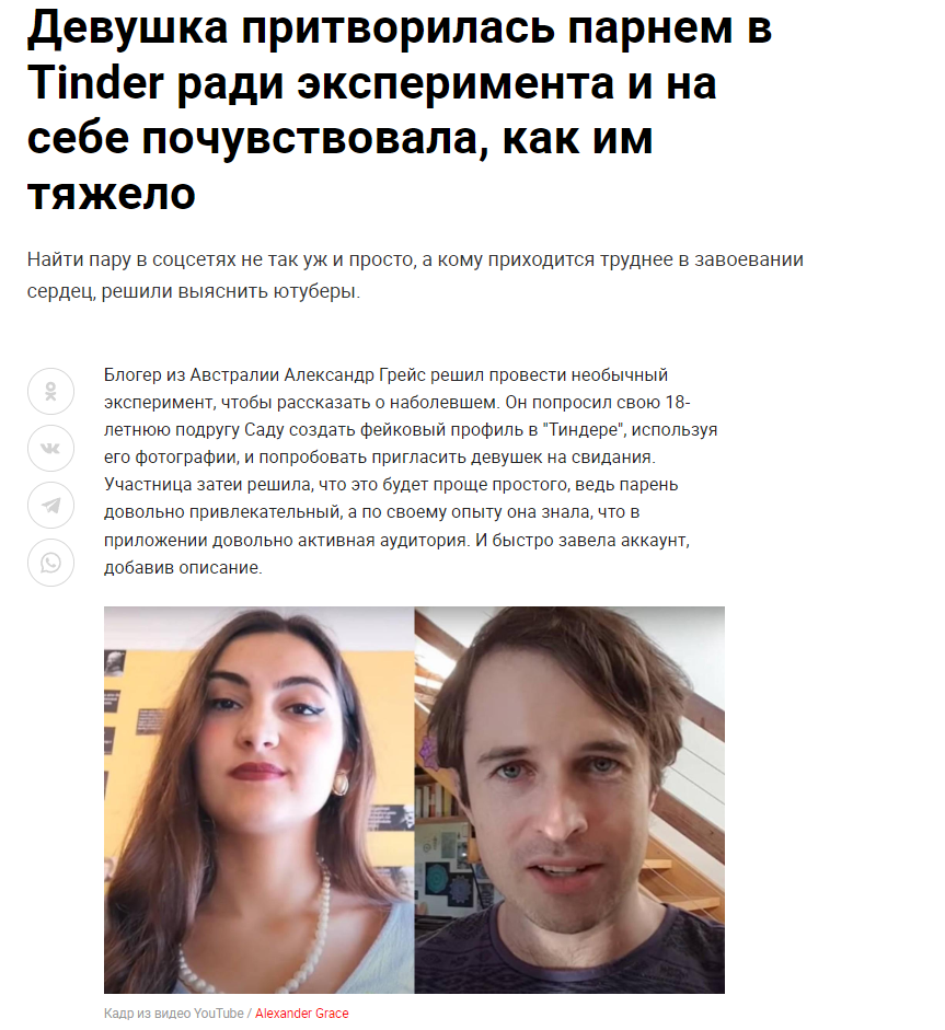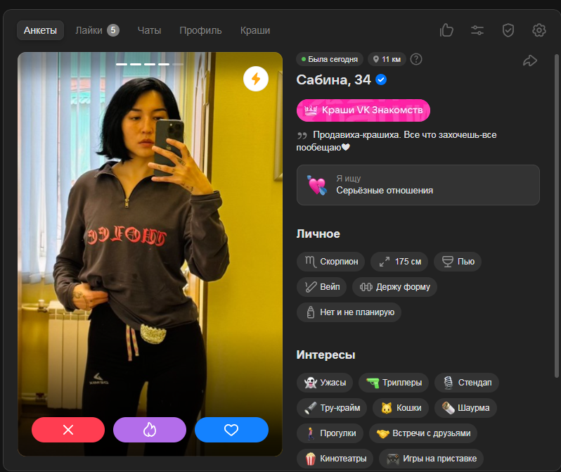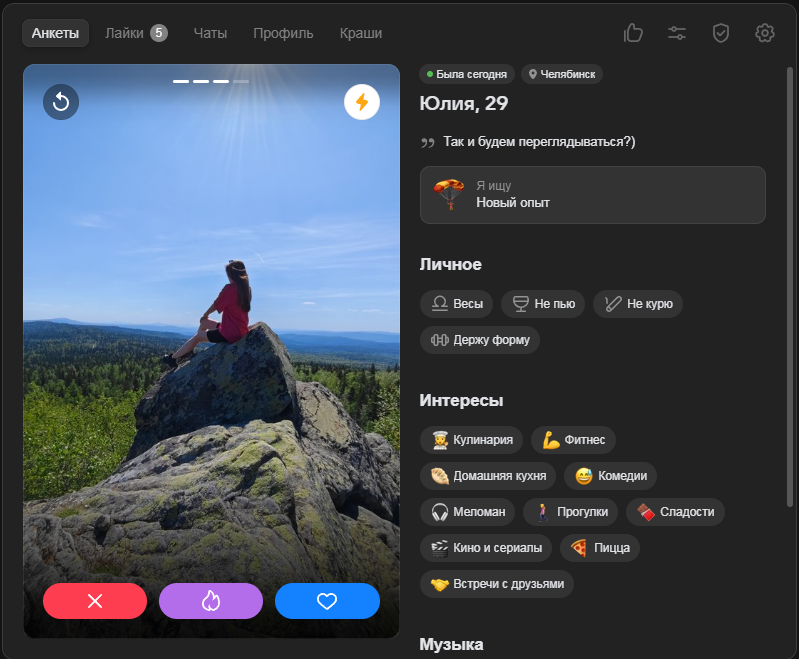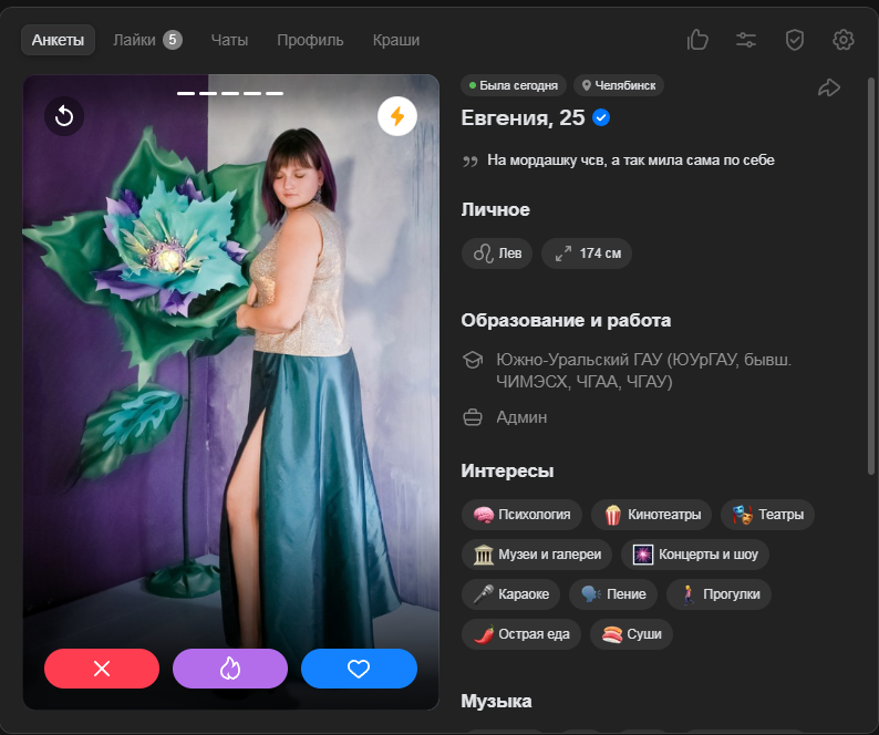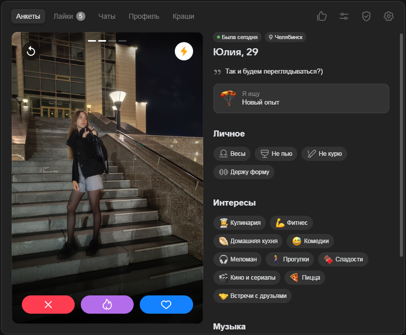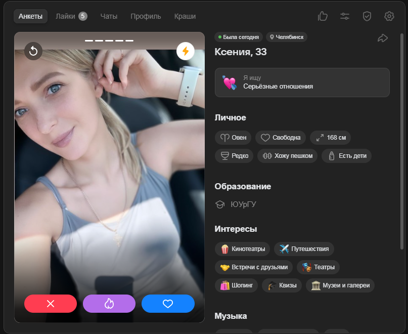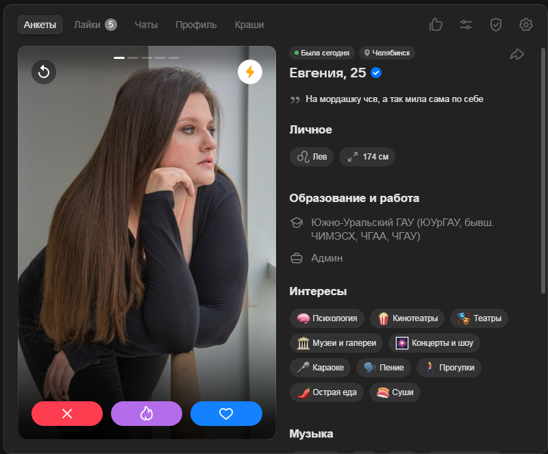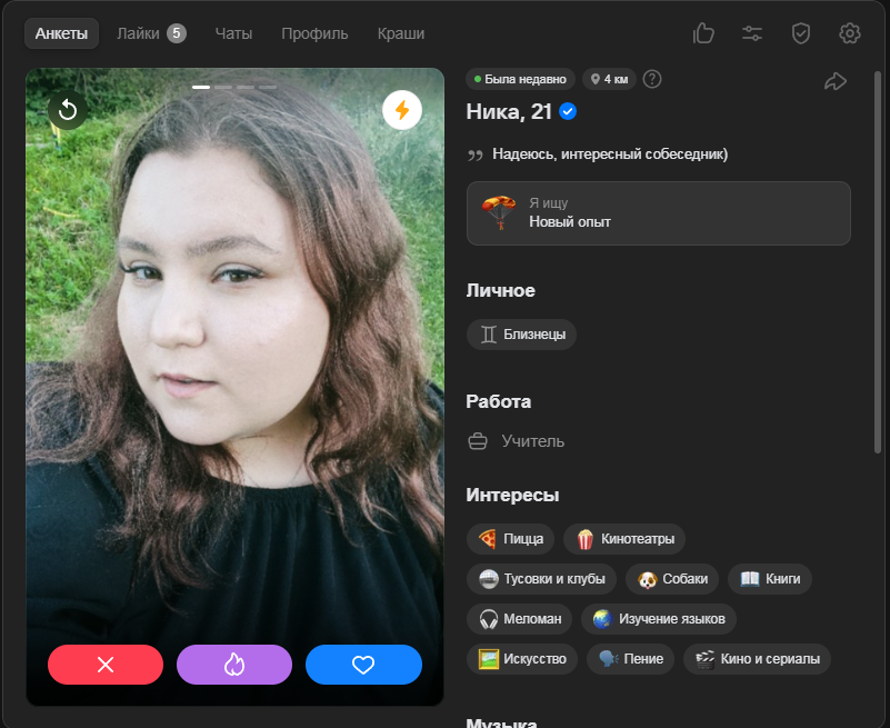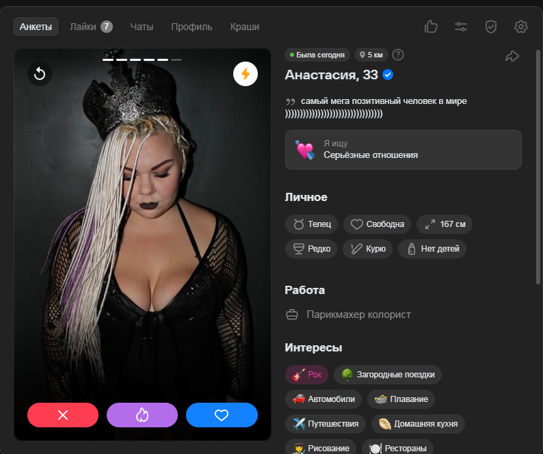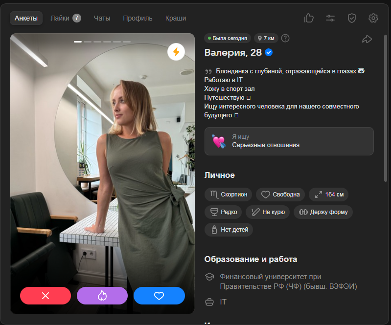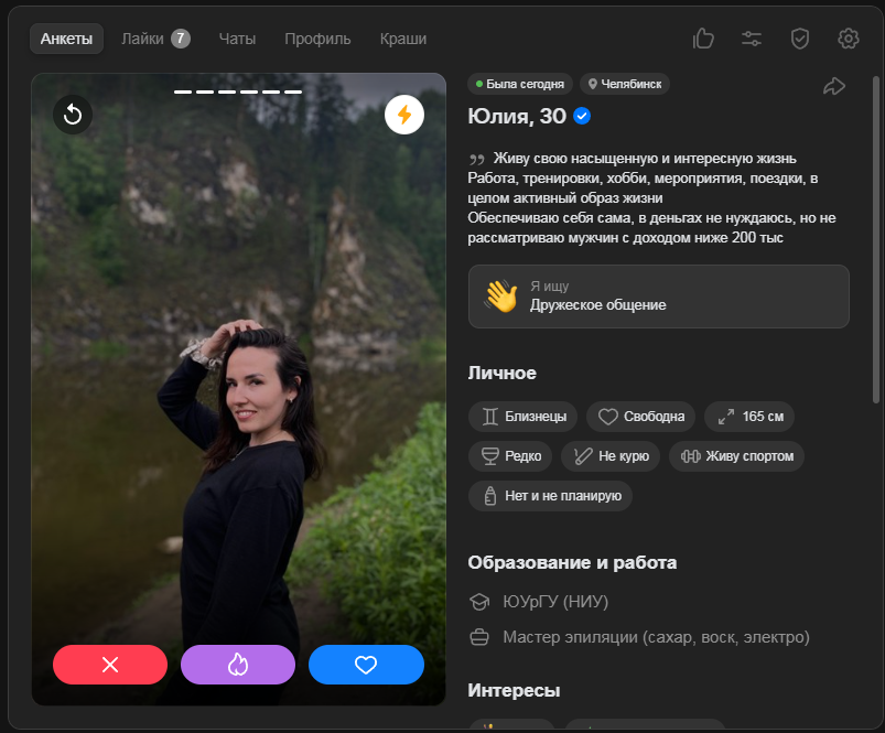 Это я вам говорю как чел который когда 7 лет назад в тиндере регался, сходу получал 10-20 матчей и затем стабильно по 2 в день лайка, сука по 4 свидания в неделю было.
