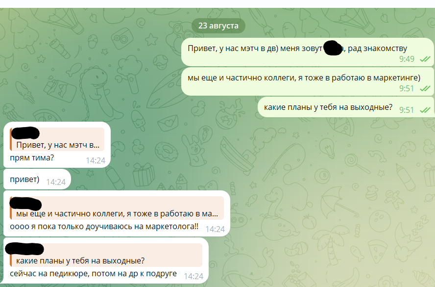 >>10299023 Первое сообщение слишком длинное - просто "Привет". "У нас мэтч в дв)" - А ЭТО ВООБЩЕ НАХУЯ? Почему пишешь имя? У тебя пустой тг без фоток без всего? Удачи с дв, лолблять. Понижаешь конверсию в 2-3-4-20 раз. "Рад знакомству" - это что такое? Фу.