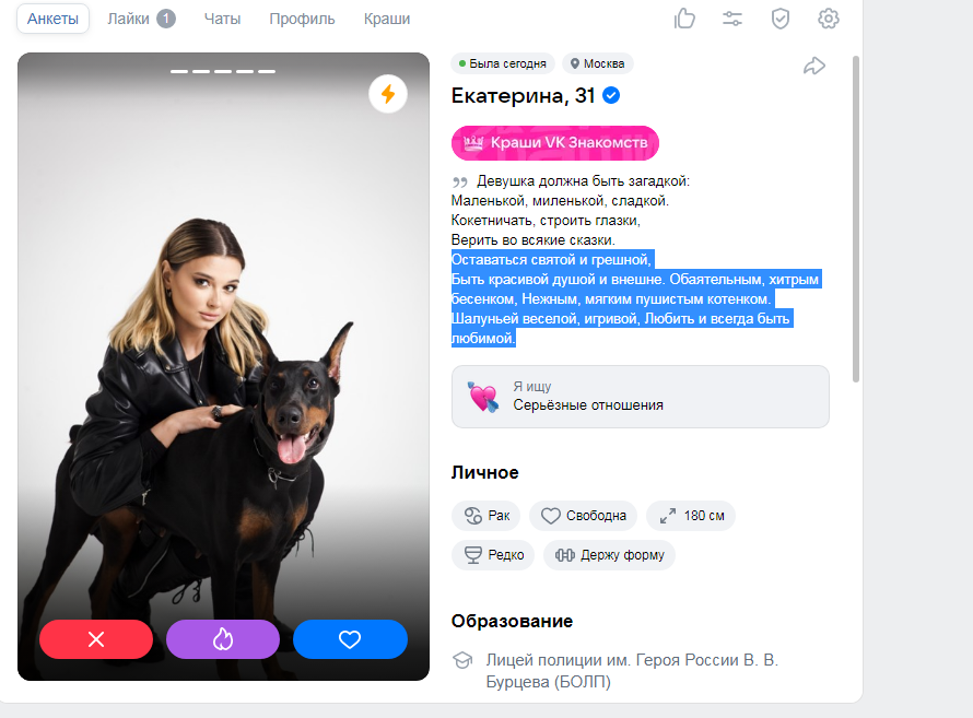 Вот анонне поделись своим опытом, на СЗ большинство анкет, "только серьезные отношения", "секс не не интересует", "на встречу не пойду, сначала заинтересуй" и тд. Кароче все это на первый взгляд выглядит бесперспективно, а главное ощущение, что какие-то бревна, которым вообще ничего не надо кроме оленя обеспечуну. Вопрос, как обстоит дело с такими анкетами на самом деле? Не в теории, а именно по вашему опыту? Можно таких тянок дергать для нормального взаимодействия? Ну типа досуг + ебля? Без этой хуйня про дохуя "серьезность", я понимаю что чаще всего вообще не стоит слушать бабу, что она там говорит, но также есть стойкое ощущение, что если баба такое с первых строк пишет, то она ну неадекватная какая-то, более того, редко, но встречал знакомых тян, которых ну считал адекватными, и у них такой хуйни в описании небыло, там пару забавных фактов о себе, описание как любит поводить время, и какая-нибудь шутейка например, без этой ебанины.