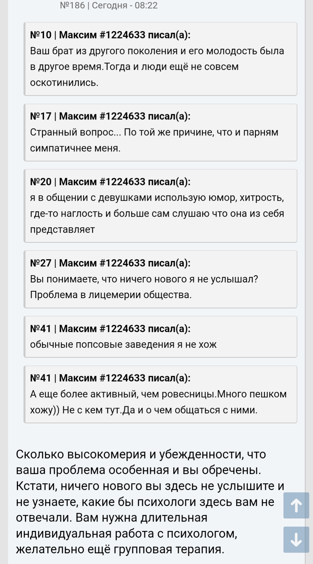 >и бери все до чего сможешь дотянуться что я должен брать? мне 30 в этом году, девственник без друзей и общения. у нормисных тян к этому времени уже дети и бывшие за плечами, а я чистый лист, я для них презираем, отброс и биомусор