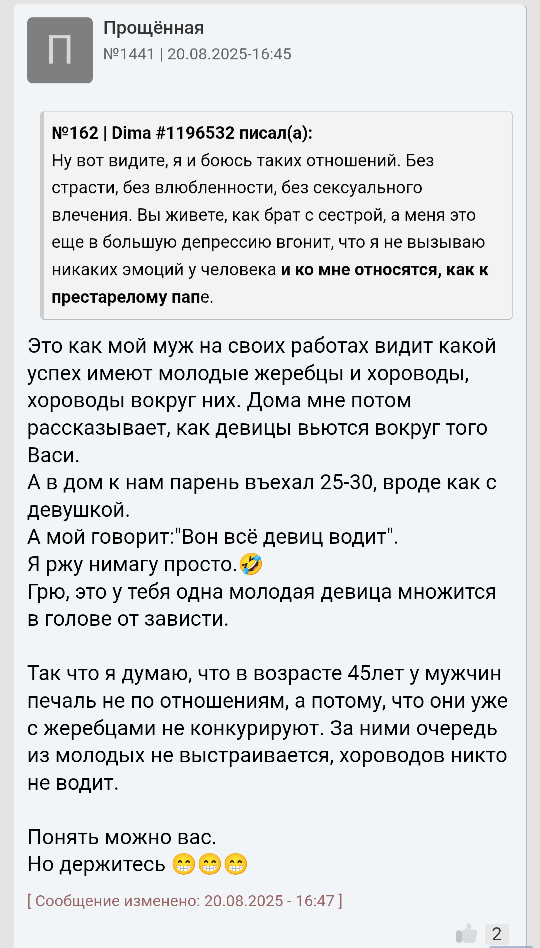 >>10306549 Вспомнился, кстати, один момент из прошлого: у родителей были гости и к нам пришел один из папиных друзей, с которым мы всегда хорошо общались. Мы пошли как обычно курить на балкон, разговорились по поводу отношений и он мне тогда одну фразу сказал, что, типа, у тебя есть буквально пару лет, чтоб найти себе женщину и создать семью, а потом уже поздно будет. Мне тогда было 29. А пару лет назад опять зашел разговор и он сказал, что, типа, теперь только разве что вдовушку себе найдешь. Я всему этому не предавал значение, что тогда, десять лет назад, что во время нашего последнего разговора 2 года назад. Вот откуда он знал? Он ведь даже не в курсе по поводу моих проблем с женским полом!