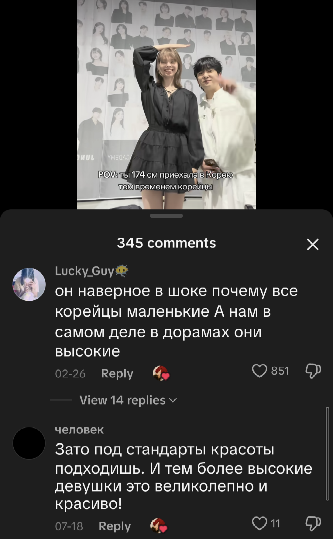 Комменты просто атомный блэкпил тут. Нашел только что. - А высоким девочкам ходить с мальчиками 170? Ну просто все миниатюрные разбирают высоких,а высоким потом грустить😢 - Солнце, я уверена, что все будет!! 🥺 - Ну блин,разве это хорошо,когда партнер ниже тебя?